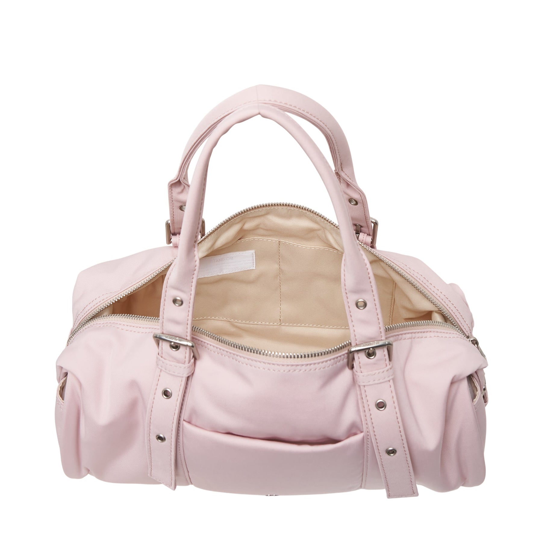 The STAND OIL Comfy Duffle Bag delivers sophisticated travel functionality with premium leather construction. Crafted from supple pink leather with adjustable buckle straps and reinforced stitching throughout for durability. The structured silhouette and minimalist hardware create a refined accessory perfect for weekend getaways or gym sessions.