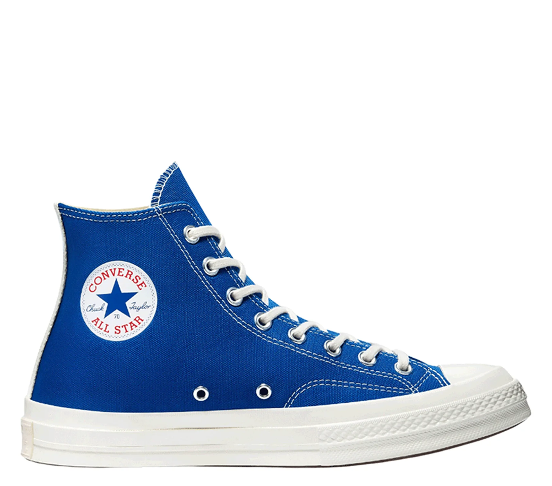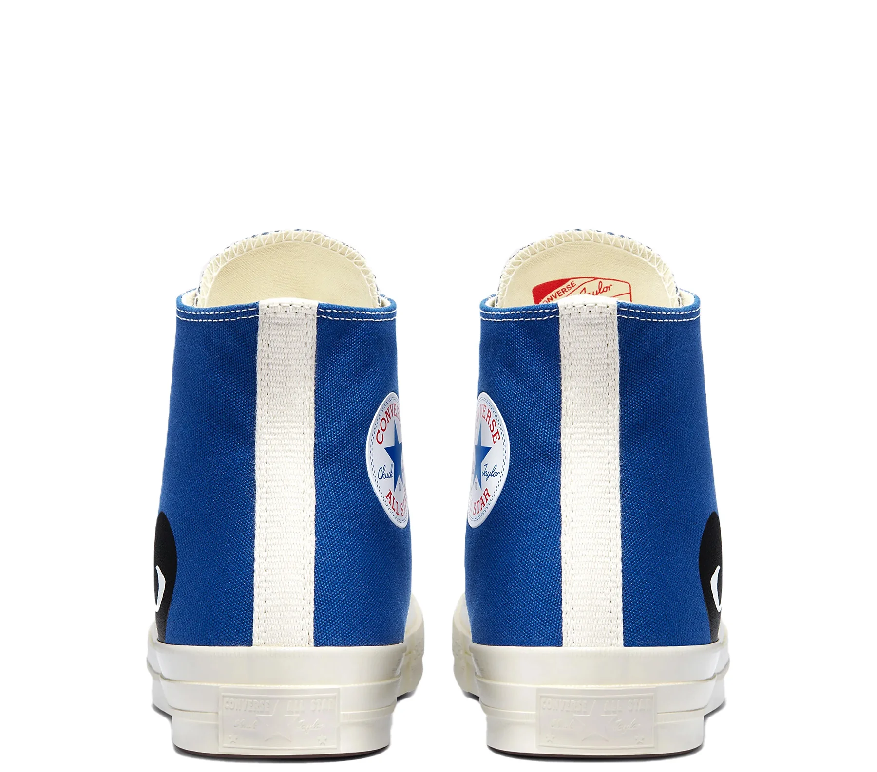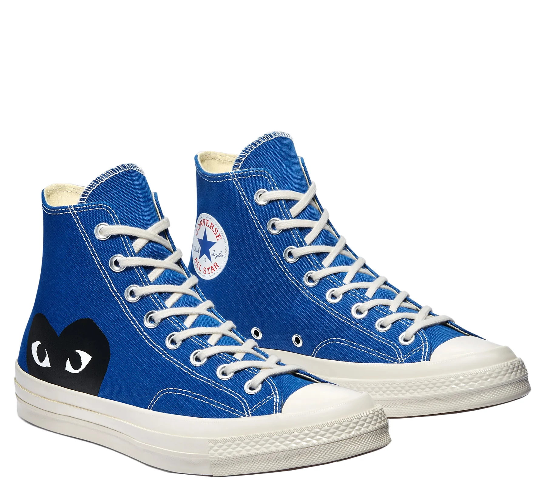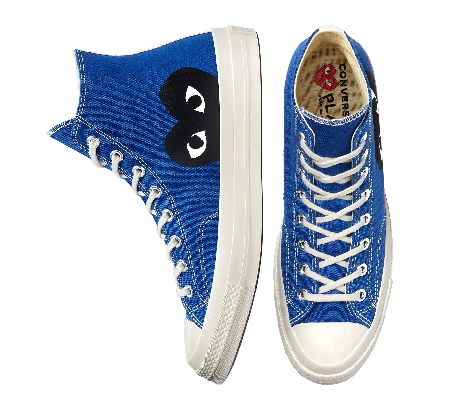 This COMME des GARCONS PLAY x Converse sneaker features a premium canvas upper with an oversized, iconic CDG PLAY heart-and-eyes graphic. Ortholite insoles for comfort. Rubber outsole and toecap.