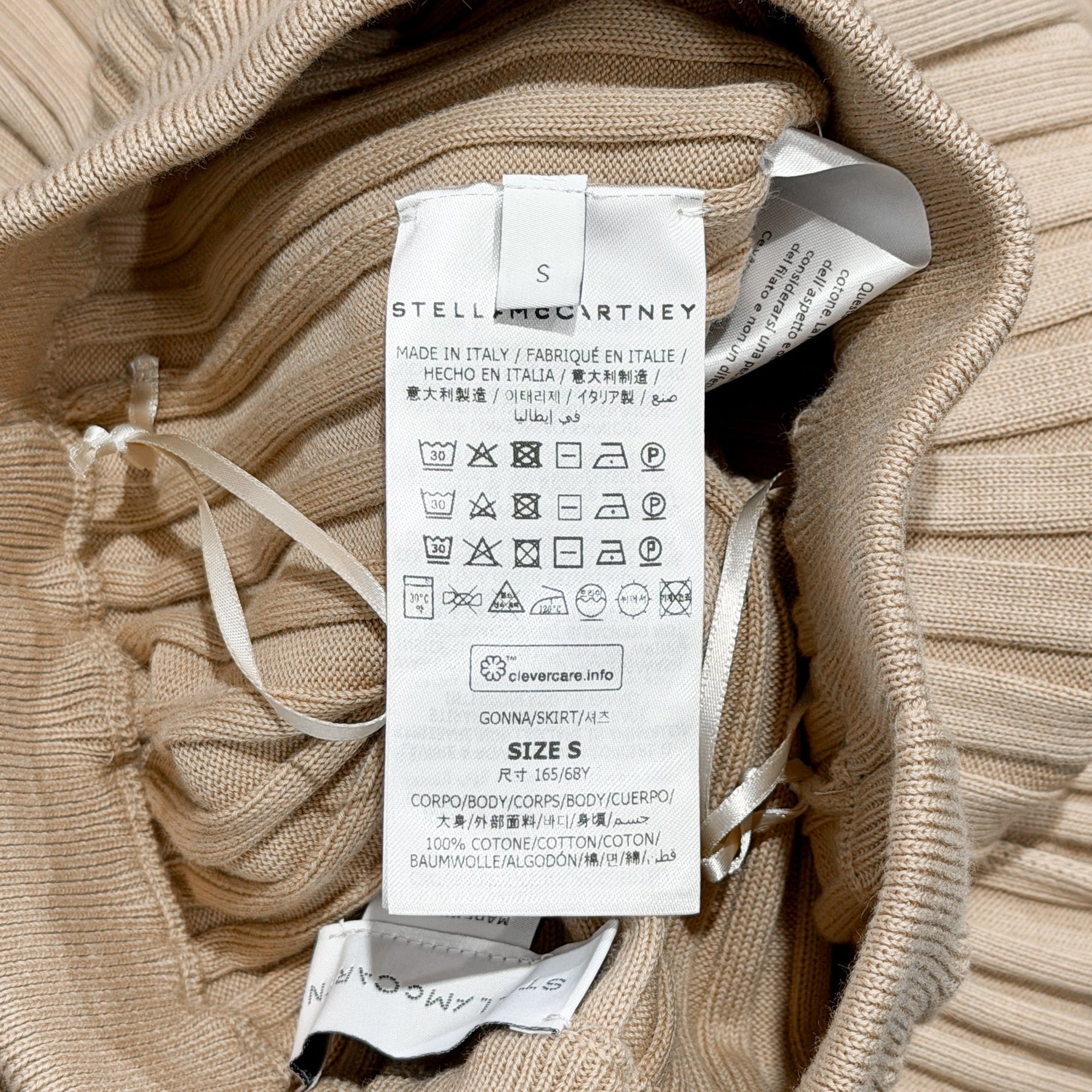 The Stella McCartney Cotton Ribbed Skirt delivers contemporary elegance with sustainable luxury craftsmanship. Crafted from premium ribbed cotton in warm camel tone, featuring an innovative asymmetric hemline that creates dynamic movement. The high-waisted silhouette and signature architectural draping showcase the brand's commitment to modern femininity.