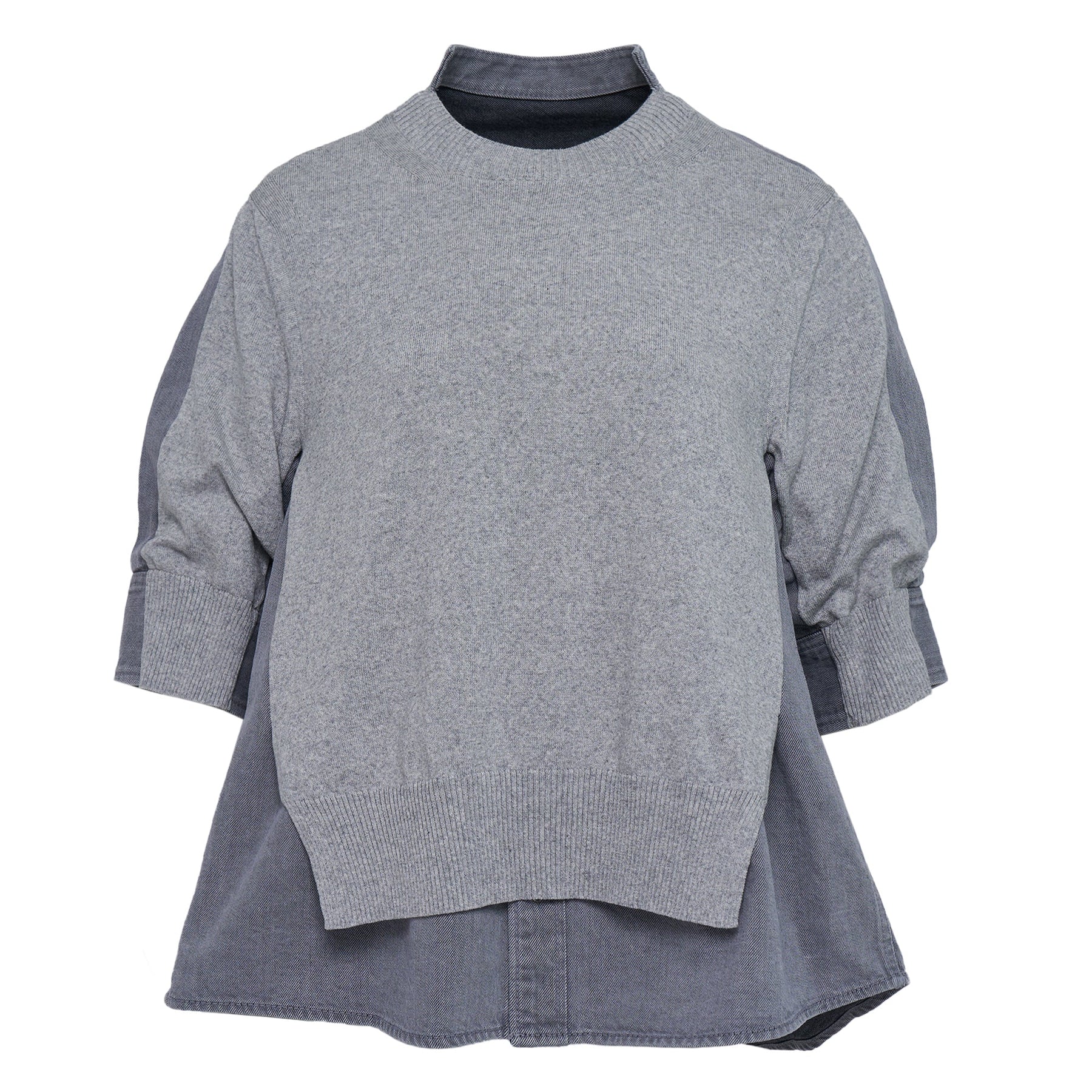 The sacai Denim x Knit Pullover delivers hybrid design innovation with the brand's signature material mixing approach. Combining soft knitted construction with structured denim shirting elements in sophisticated gray tones, creating dimensional layered silhouettes. The deconstructed design and signature sacai aesthetic merge comfort with architectural sophistication.