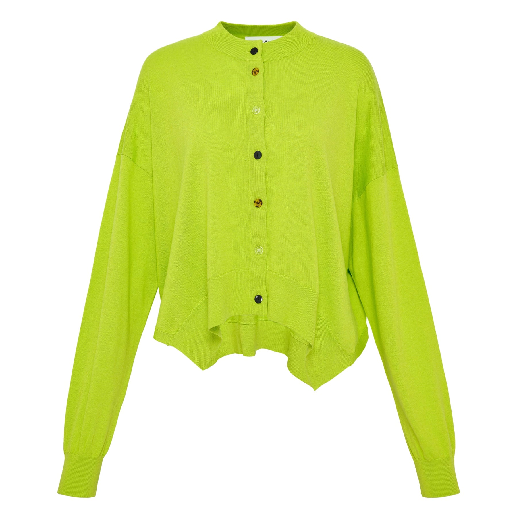 ENFOLD High Neck Box Cardigan delivers contemporary Japanese minimalism with architectural silhouette and modern sophistication. Crafted from premium knit fabric in vibrant lime green, featuring mixed button details and asymmetrical hemline construction. The structured boxy fit and signature ENFOLD design aesthetic create a statement piece for elevated casual styling.