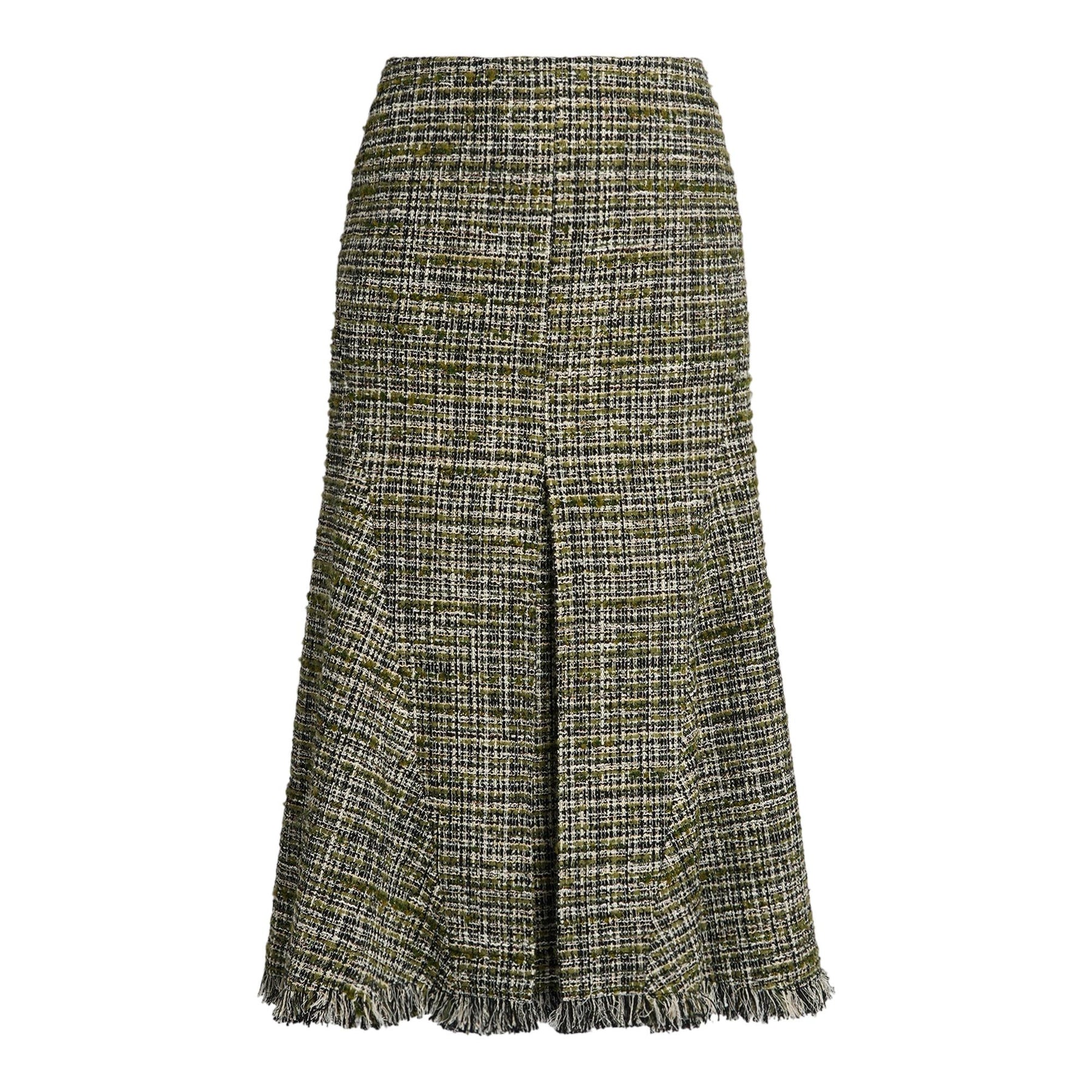 This A-line skirt is made from olive tweed and features a raw-edged hem.
