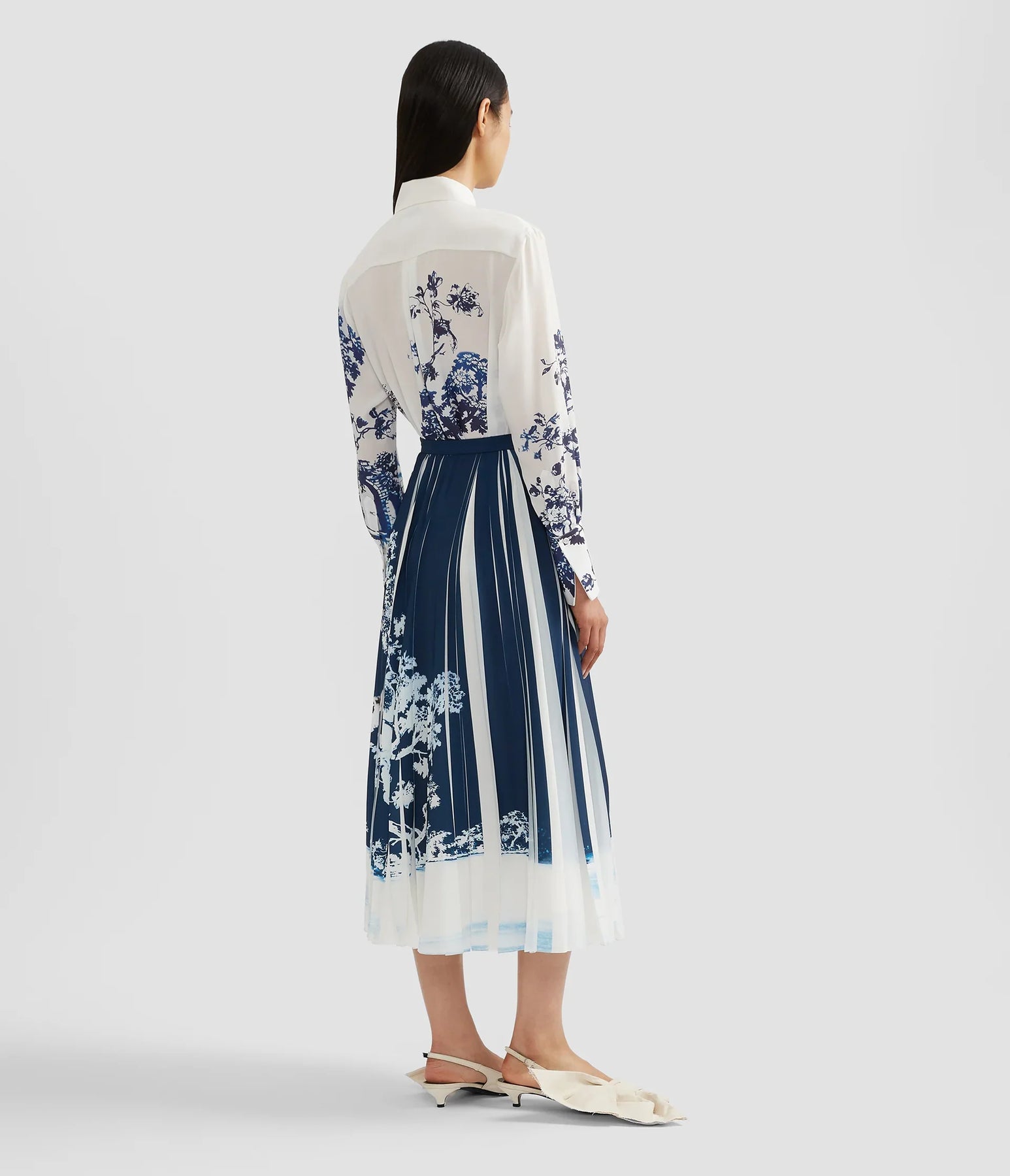 This blue and white A-line skirt is made from lightweight crepe de chine. It is pleated to create breaks in the print.
