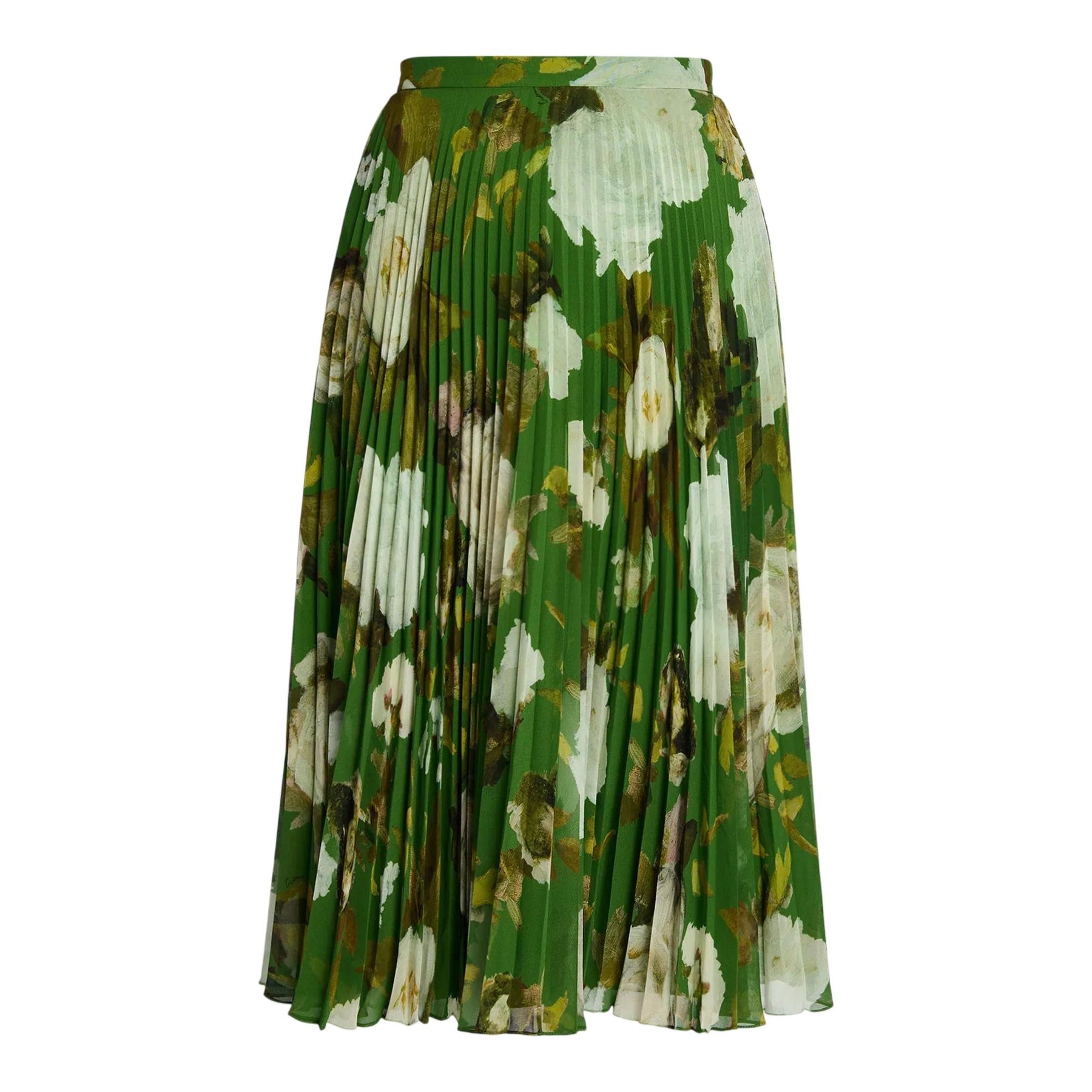 Pleated for added movement and texture.This pleated mid-length skirt is cut from lightweight voile and decorated with a green floral print.
