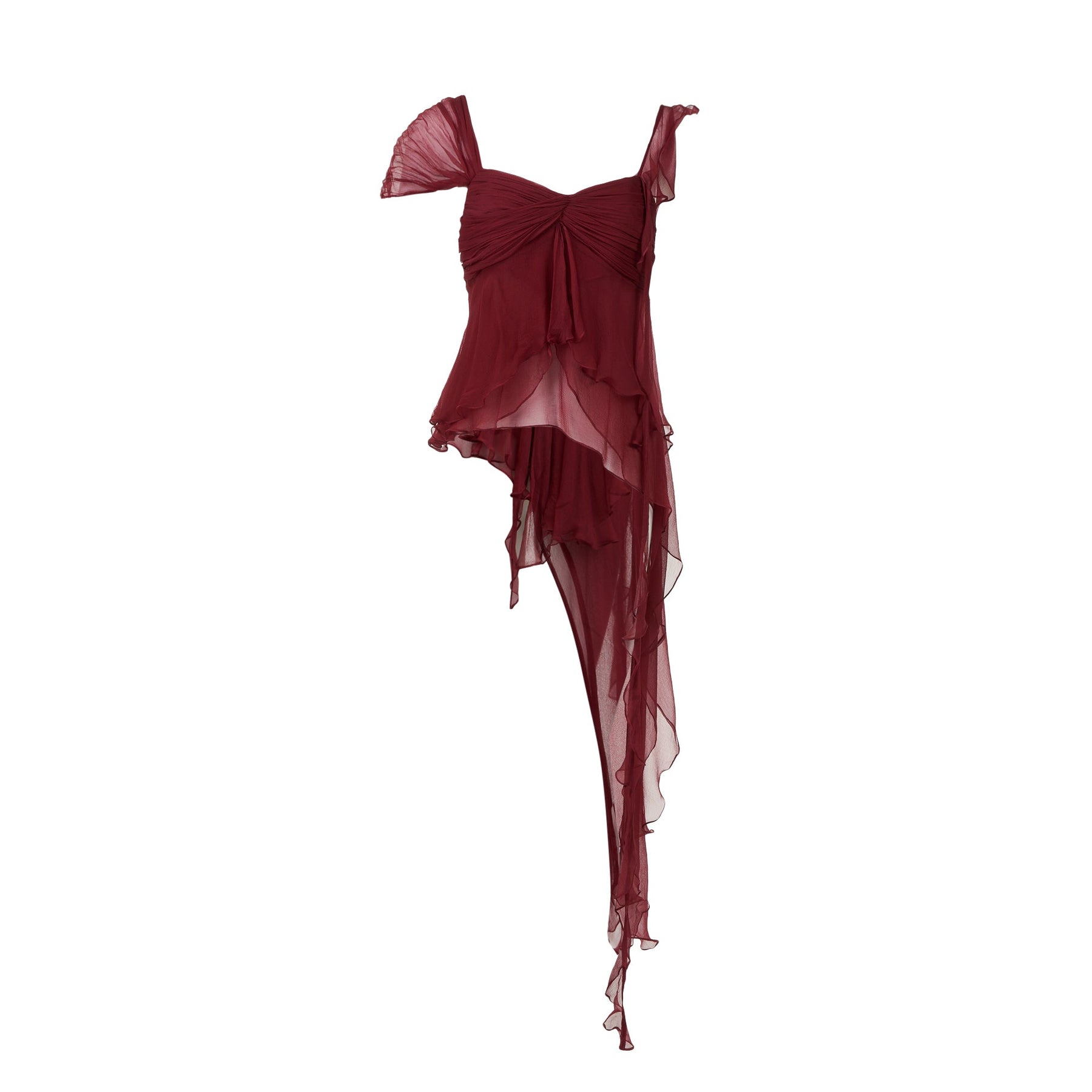 The Stolen Stores Fairy Mini Top delivers romantic femininity with dramatic draping and ethereal construction. Crafted from flowing burgundy chiffon with gathered bust detailing and cascading asymmetrical hemlines that create movement and visual interest. The delicate cap sleeves and twisted front knot add signature bohemian elegance to contemporary styling.