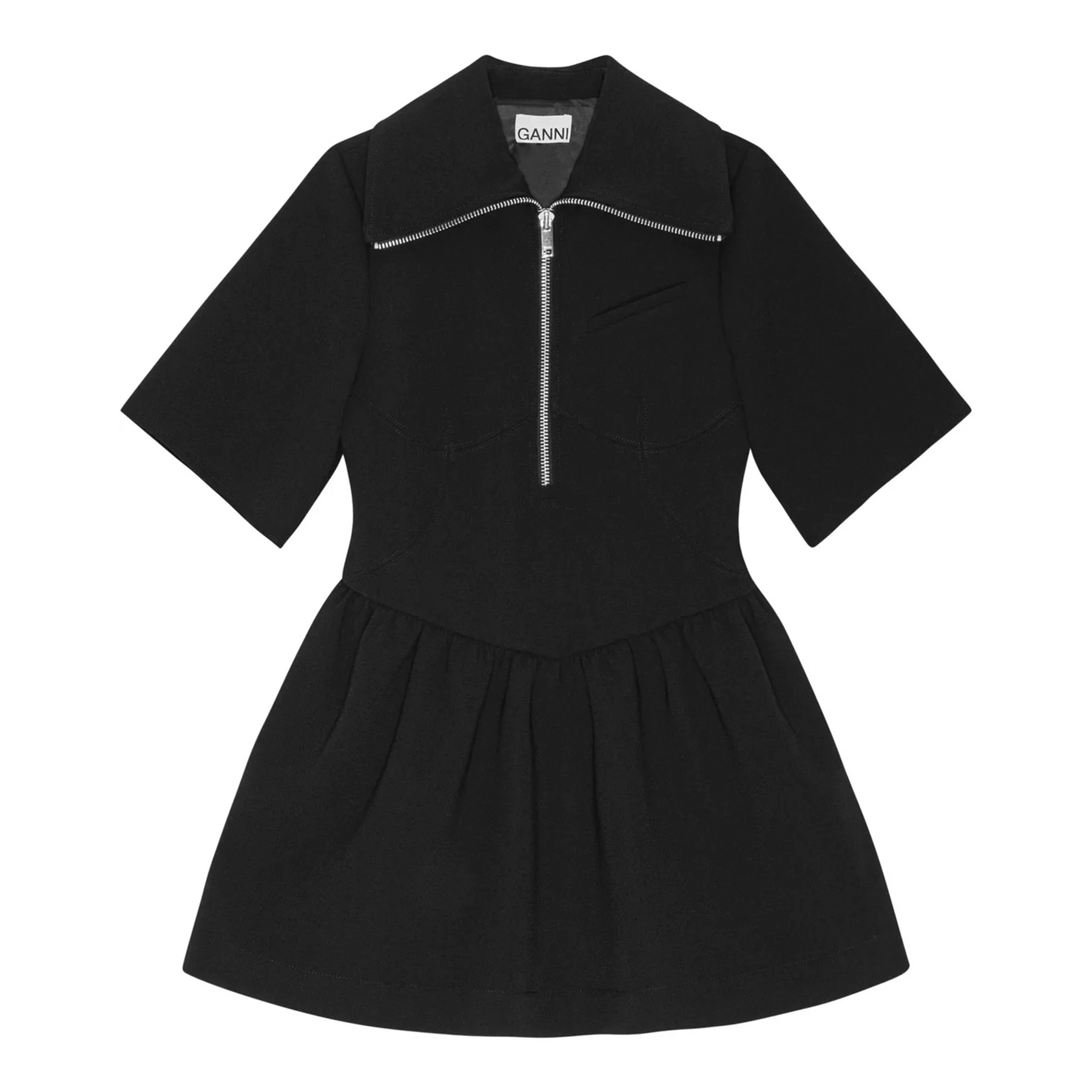 The Black Bonded Crepe Mini Dress is defined by a bold heavy silver zipper and a playful flouncy skirt, making it perfect for both everyday wear and special occasions. Crafted from recycled polyester with a textured, crepe-like finish, this mini dress features a versatile high collar that can be worn up or folded down and is finished with black stitch detailing.