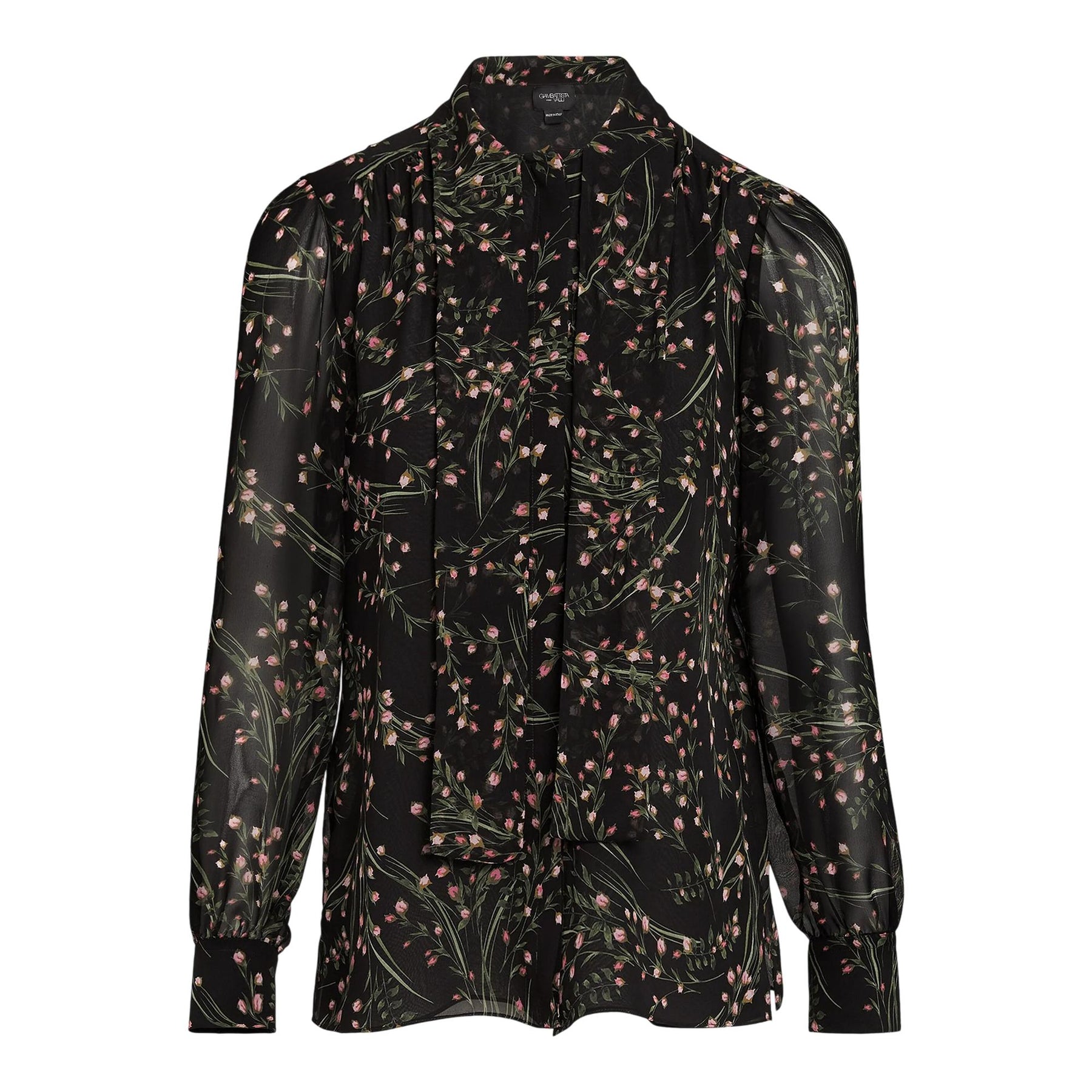 This black silk georgette blouse features the wild flowers print. It has a self-tie neck.