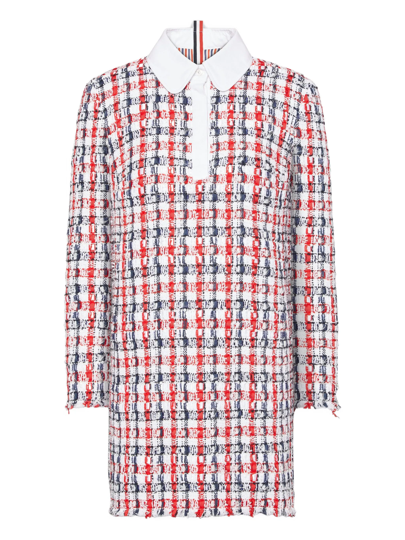 Thom Browne Gingham Satin Ribbon Tweed Shift Dress delivers sophisticated preppy elegance with signature collegiate details. Crafted from premium tweed in red, white, and navy gingham pattern with contrasting white collar and refined tailoring throughout. The classic shift silhouette and iconic Thom Browne aesthetic create a timeless piece for refined wardrobes.