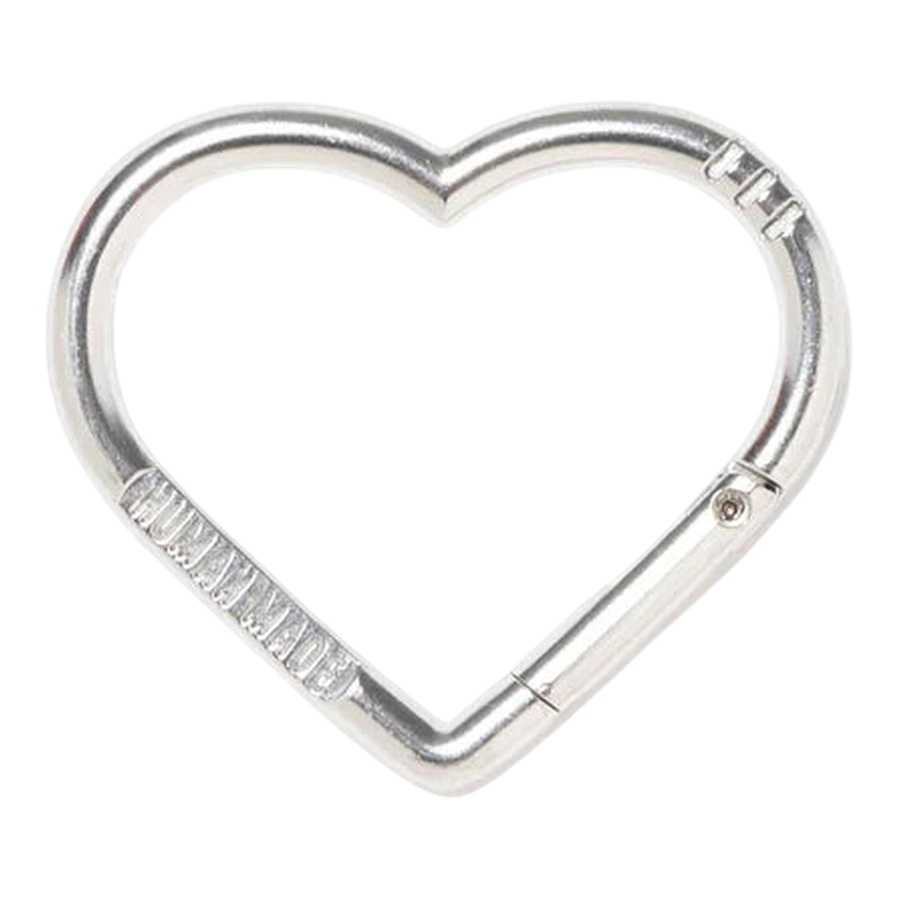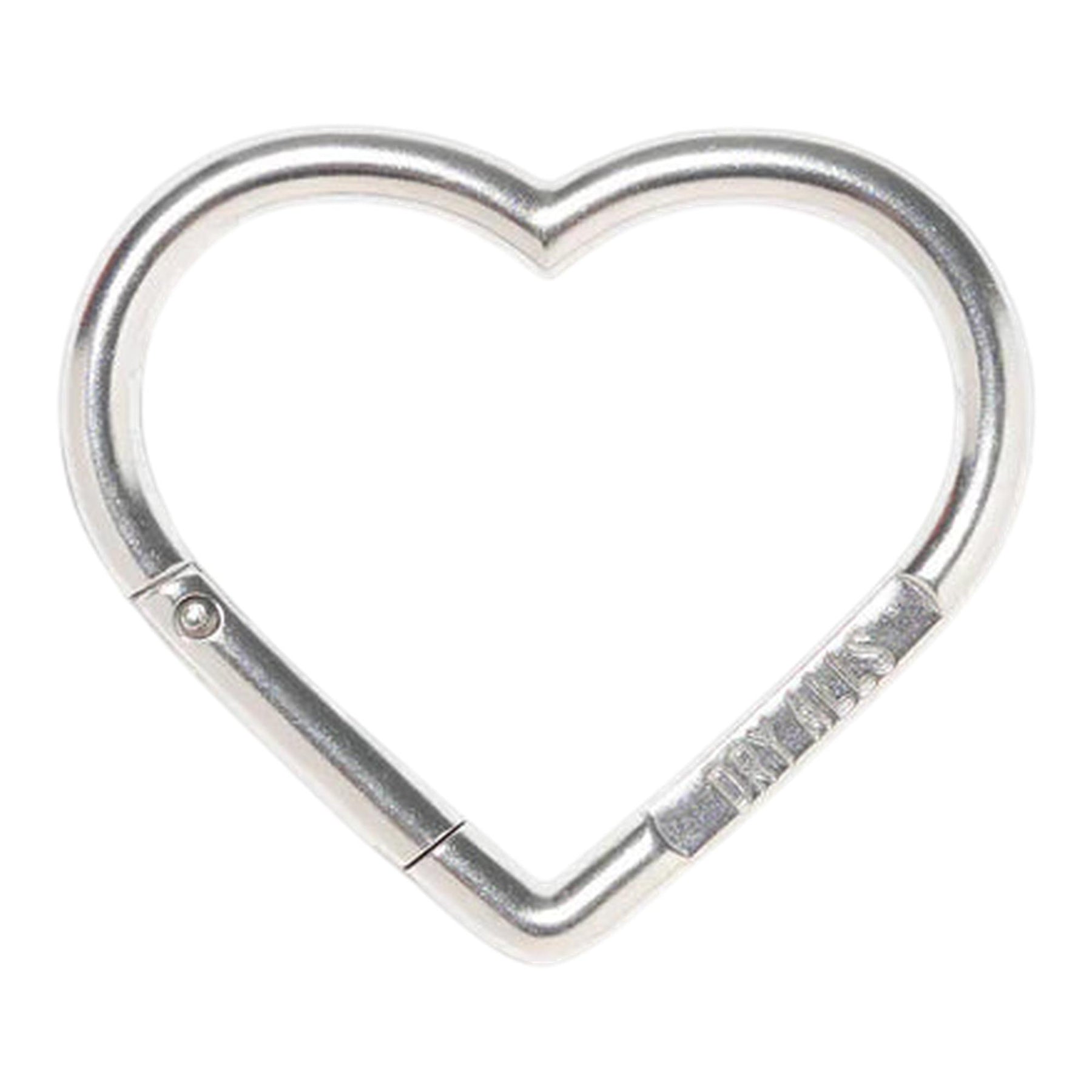 Heart-shaped carabiner with text engraved on both sides. It can be used a key ring or customized in countless ways.