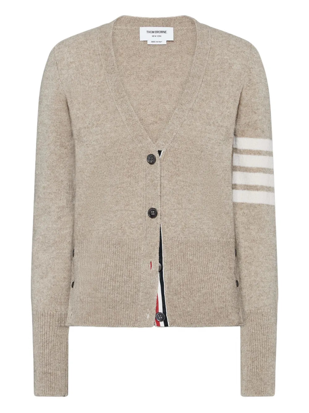 The Thom Browne Jersey Stitch Shetland Wool 4-Bar Cardigan delivers American luxury with signature collegiate-inspired details and architectural tailoring. Crafted from premium Shetland wool in sophisticated light gray, featuring the brand's iconic four-bar stripe detail on the sleeve. The jersey stitch construction and V-neck silhouette create a refined preppy aesthetic with Thom Browne's distinctive New York sophistication.