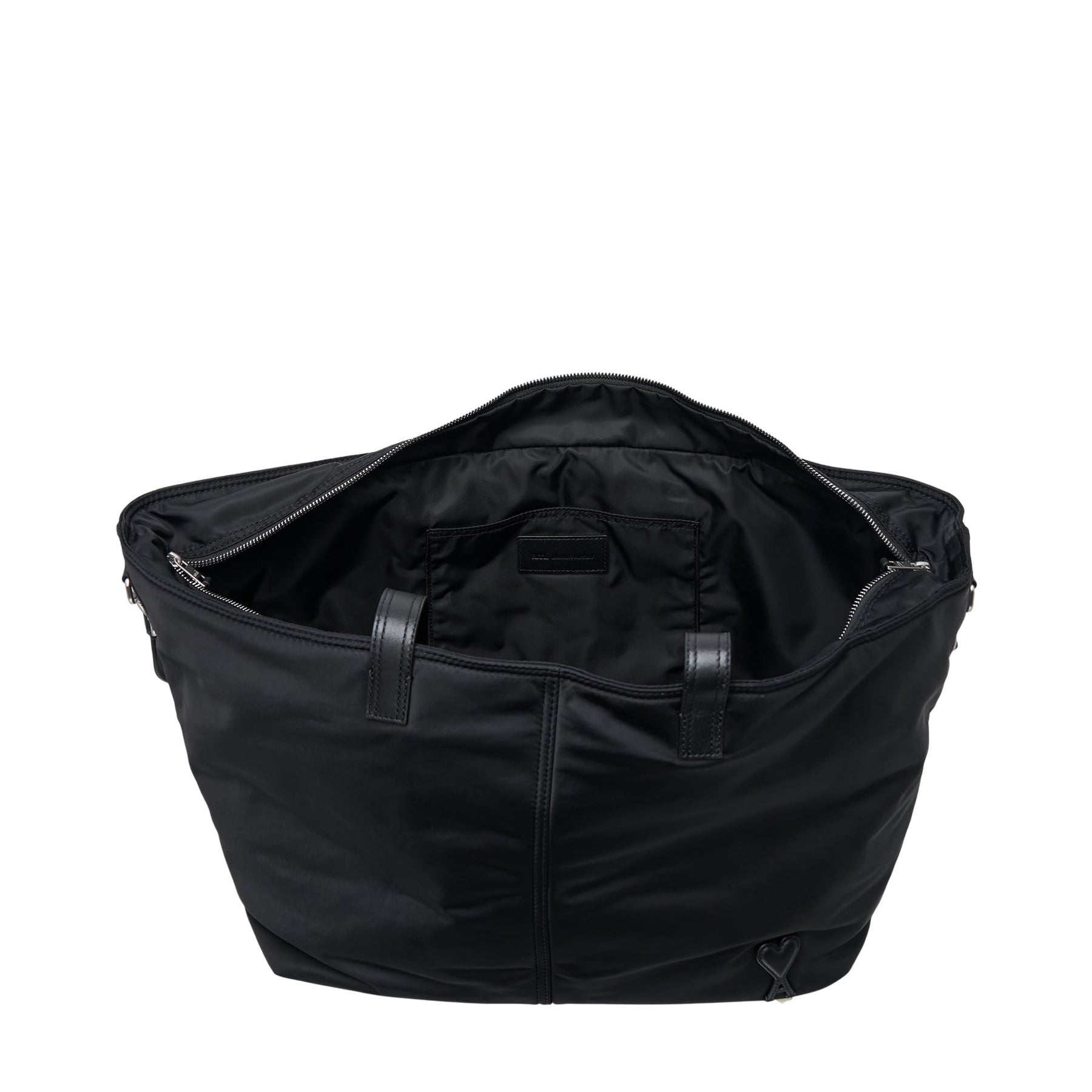 The AMI Marcel Small Shopping Bag delivers French minimalist sophistication with practical everyday functionality. Crafted from durable black nylon with leather trim handles and subtle AMI logo embossing for understated luxury. The compact tote silhouette and clean aesthetic make it perfect for daily essentials while maintaining Parisian elegance.
