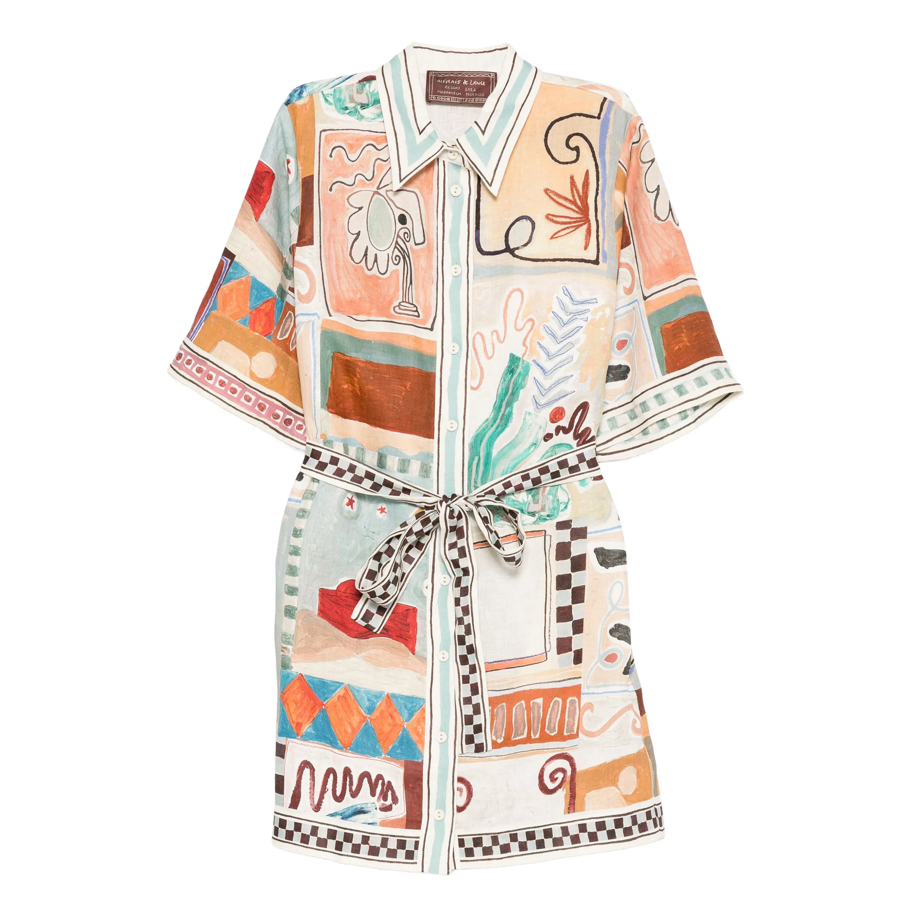 The ALEMAIS Michelle Mini Dress delivers contemporary femininity with artistic print storytelling and effortless silhouette. Crafted from lightweight woven fabric featuring an abstract mixed-media print in soft pastels with geometric and botanical motifs throughout. The relaxed shirt-dress construction and tie-waist detail create versatile styling for modern wardrobes.