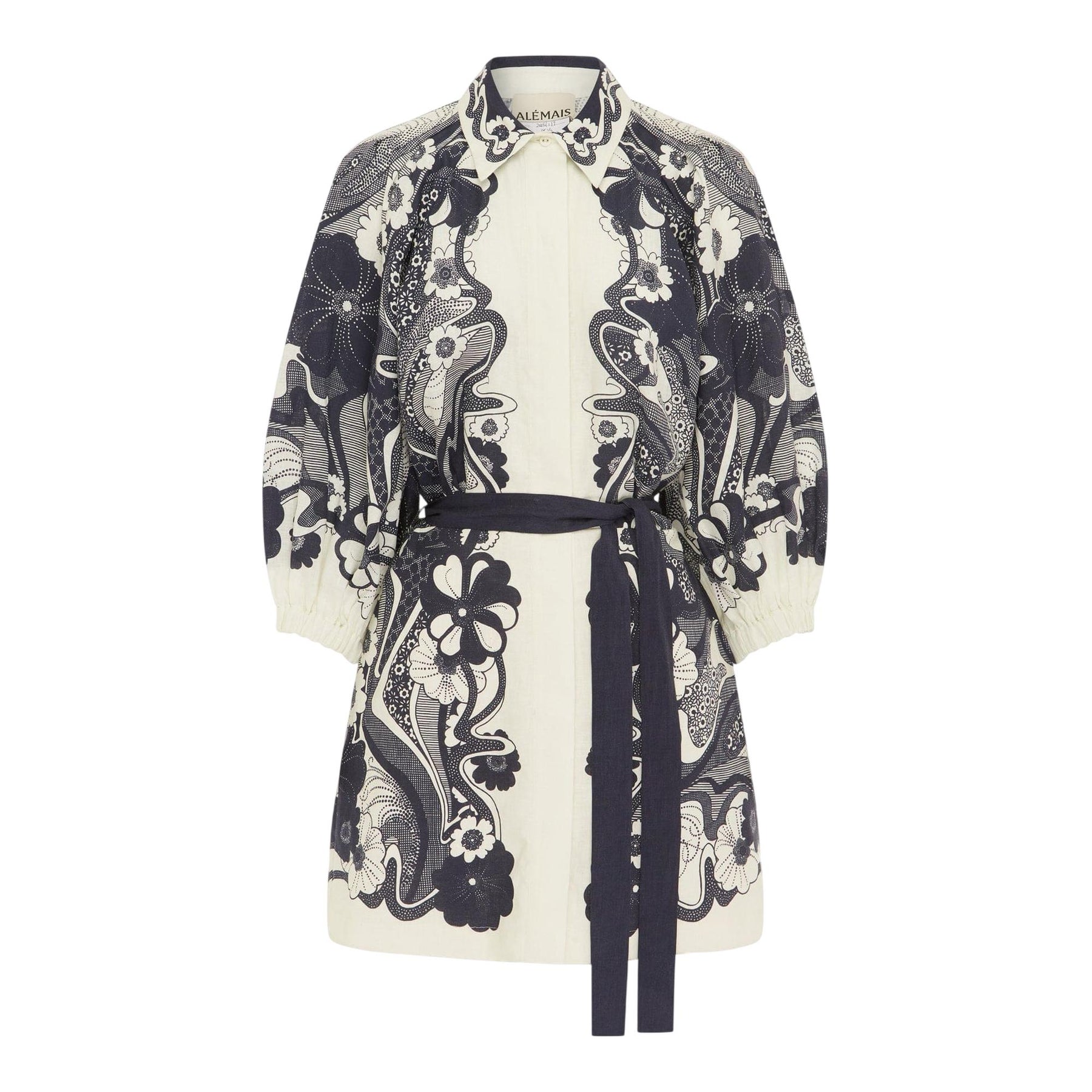 ALEMAIS Mickey Mini Dress delivers artistic sophistication with playful contemporary design and premium craftsmanship. Crafted from lightweight silk with intricate paisley and floral motifs in navy and cream, featuring a relaxed shirt-style silhouette with tie waist detail. The brand's signature botanical-inspired prints and effortless draping create a statement piece that transitions seamlessly from day to evening.