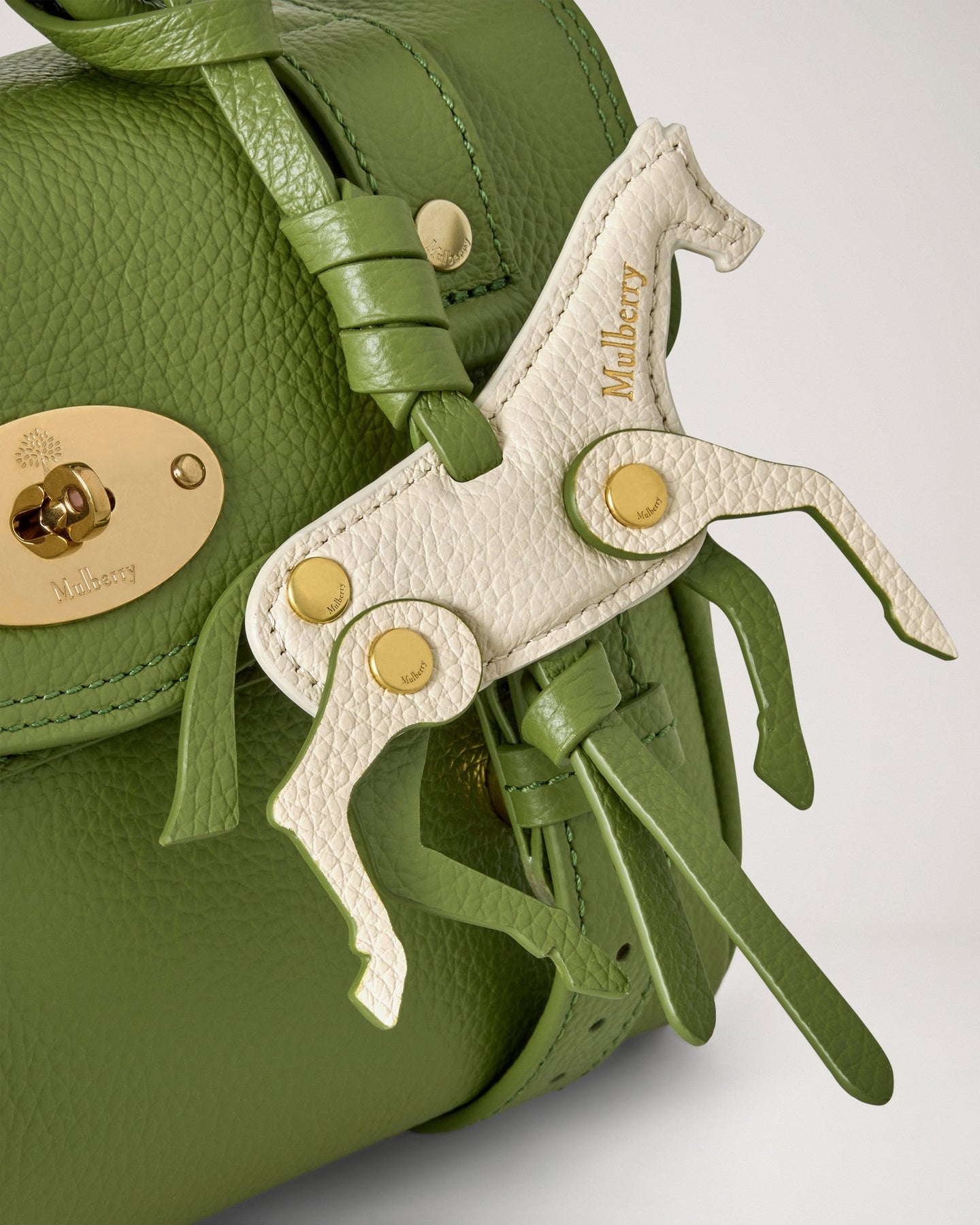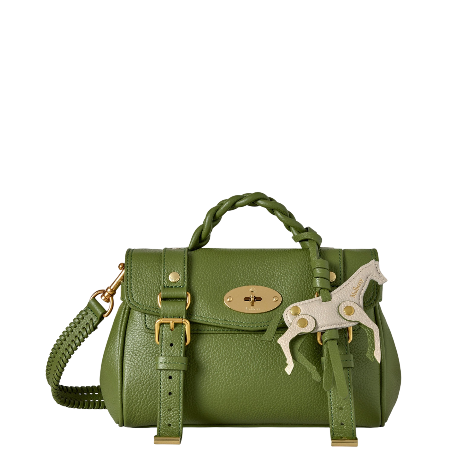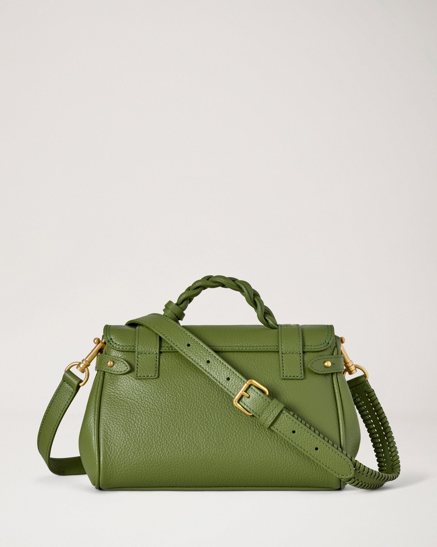 The Mulberry Mini Alexa delivers iconic British luxury in a compact silhouette with signature postman's lock closure and braided top handle. Crafted from supple pebbled leather in rich sage green, featuring gold-tone hardware and the brand's distinctive satchel construction. The mini proportions and equestrian-inspired charm create a timeless statement piece for contemporary wardrobes.