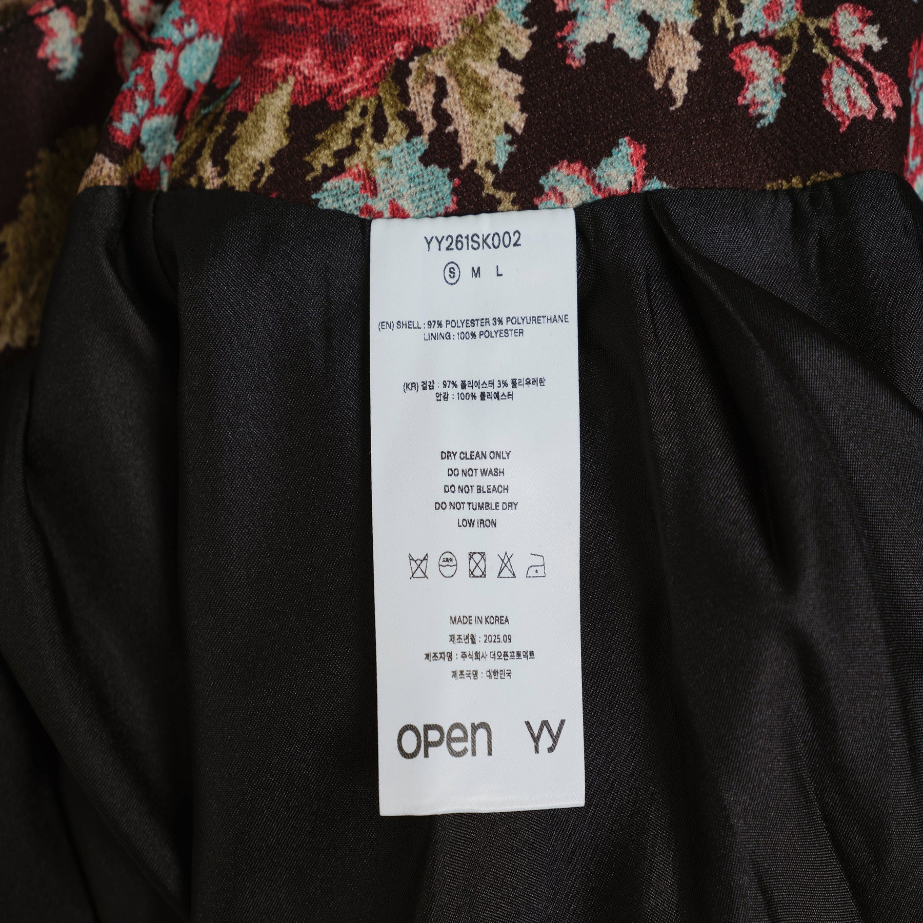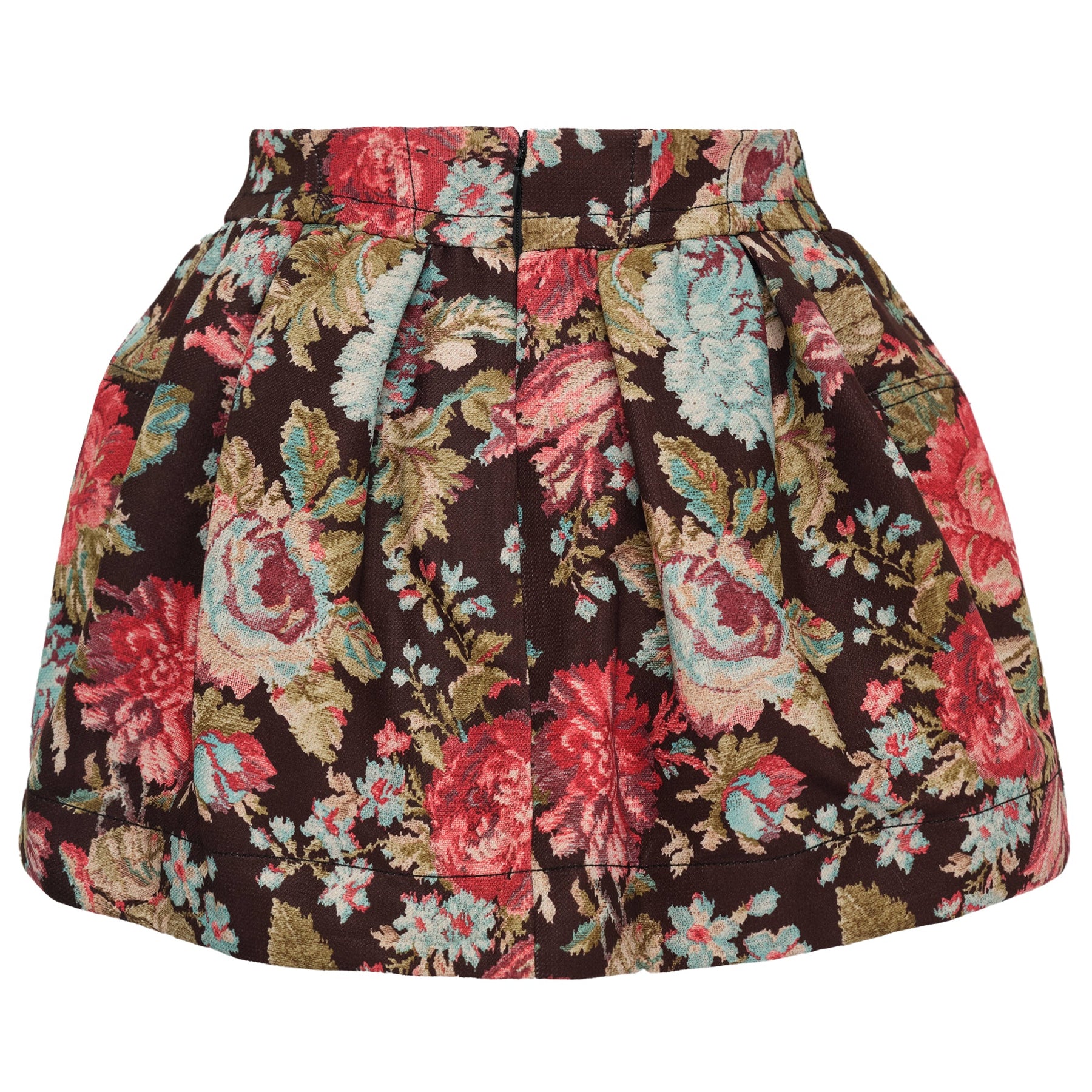 OPEN YY Mini Floral Wire Skirt delivers vintage-inspired elegance with structured silhouette and contemporary appeal. Crafted from luxurious brocade fabric featuring vibrant floral tapestry in burgundy, coral, and turquoise against a rich chocolate base. The wire-reinforced hem creates distinctive volume and shape retention for sophisticated styling.