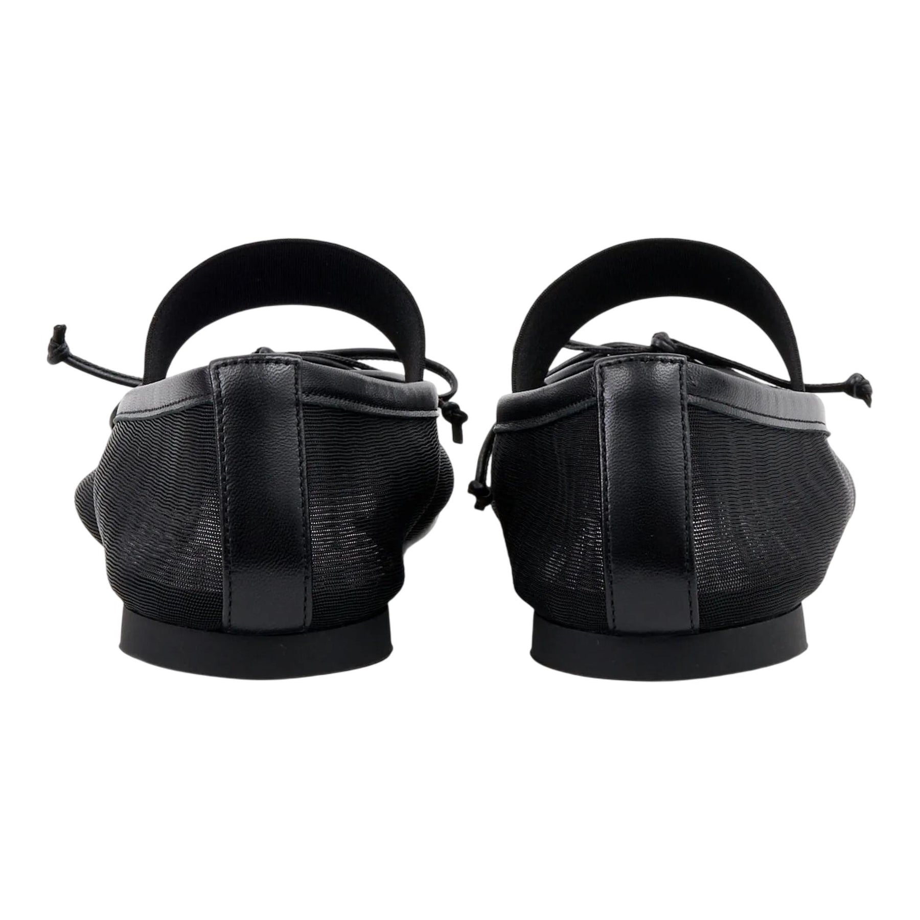 MM6 reinterprets ballerinas in a transparent finish with its signature anatomic toe, subtly distorting a familiar silhouette. A delicate bow adds a touch of elegance, while the numeric logo elastic across the front grounds the design in the Maison's codes.
