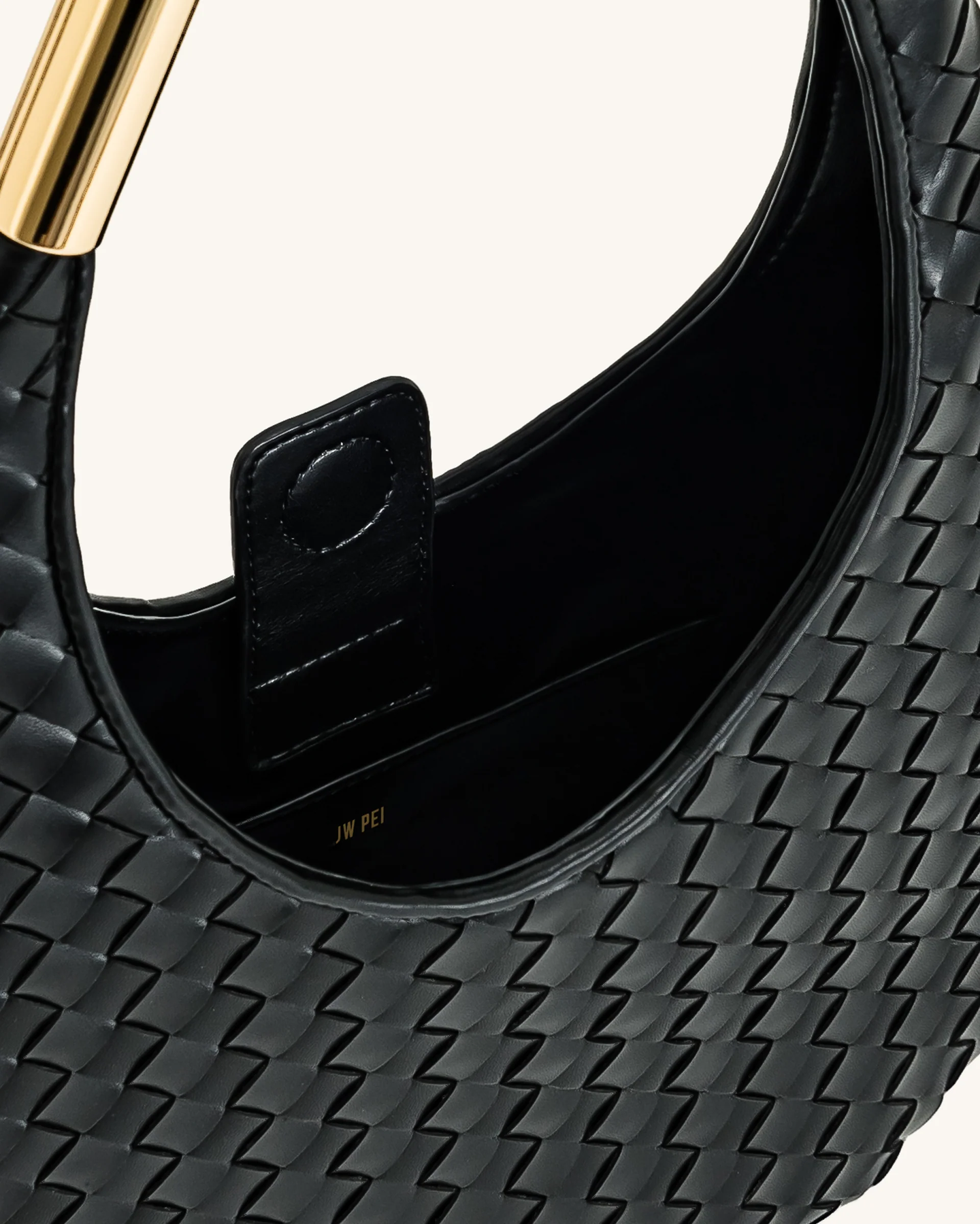 The JW PEI Olivia Hand-Woven Metal Handle Hobo Bag delivers contemporary elegance with artisanal craftsmanship and modern functionality. Crafted from premium black woven leather in an intricate basketweave pattern, featuring polished gold-tone metal handles for refined contrast. The slouchy hobo silhouette and hand-woven construction create a sophisticated statement piece for everyday luxury.