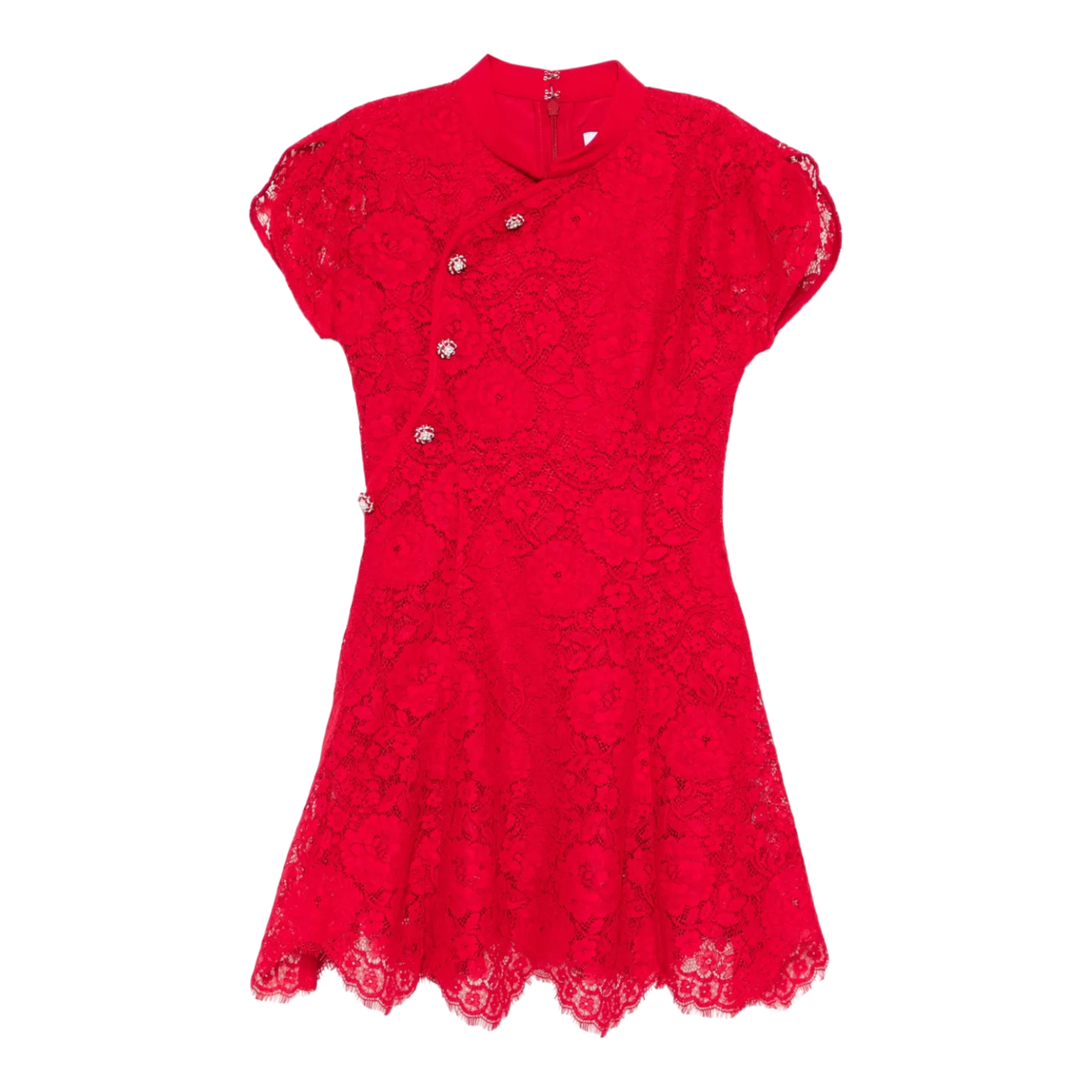Self-Portrait Red Fine Lace Mini Dress delivers romantic elegance with intricate craftsmanship and feminine silhouette. Crafted from delicate red lace with scalloped hem detailing and decorative crystal button closure, featuring the brand's signature vintage-inspired aesthetic. The fitted bodice and short cap sleeves create a sophisticated statement piece for special occasions.