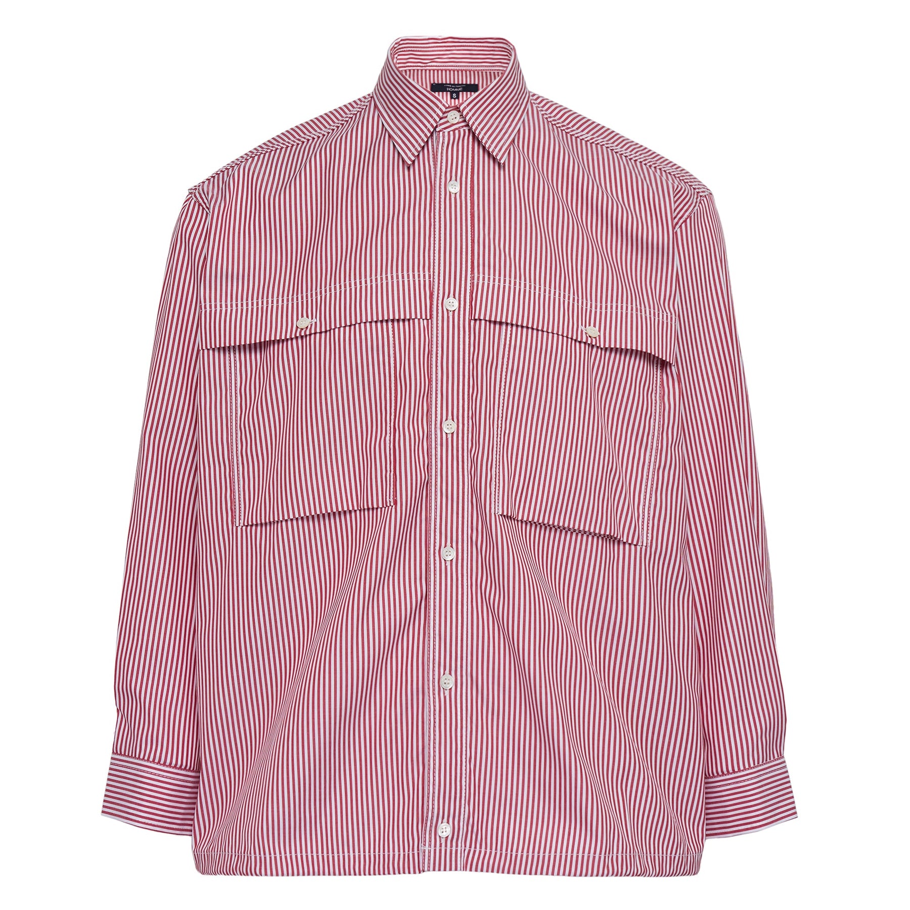 COMME des GARCONS HOMME red stripe button-up shirt delivers avant-garde tailoring with signature deconstructed design elements. Crafted from premium cotton poplin with vertical red and white stripes, featuring dramatic cape-like overlay panels across the chest and sleeves. The architectural silhouette and innovative construction showcase the brand's pioneering approach to contemporary menswear.