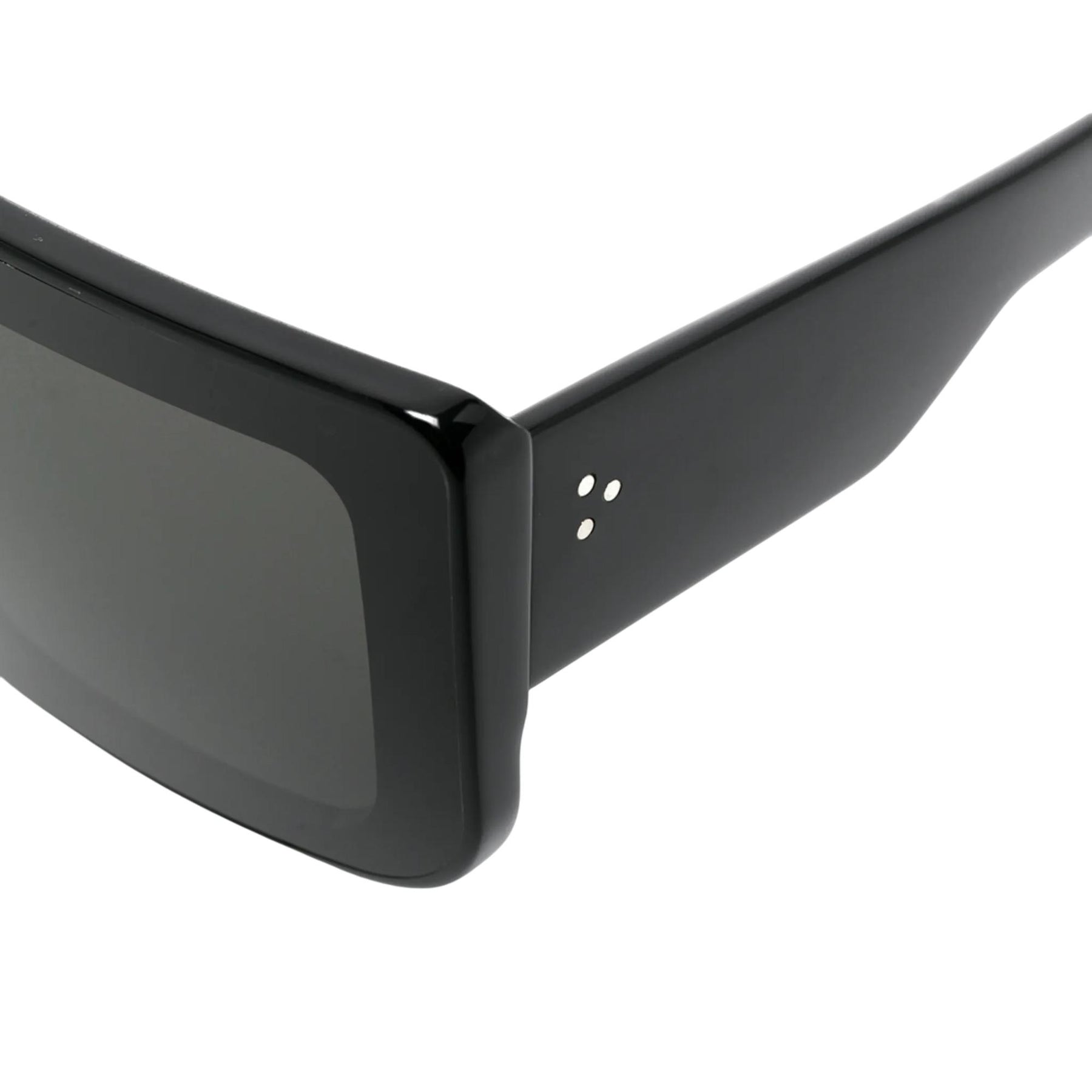 These documenta sunglasses feature a large black acetate rectangular frame and a black single cut lens. They have wide arms with the signature trio of silver rivets on each temple and Rick Owens logo on inside right.