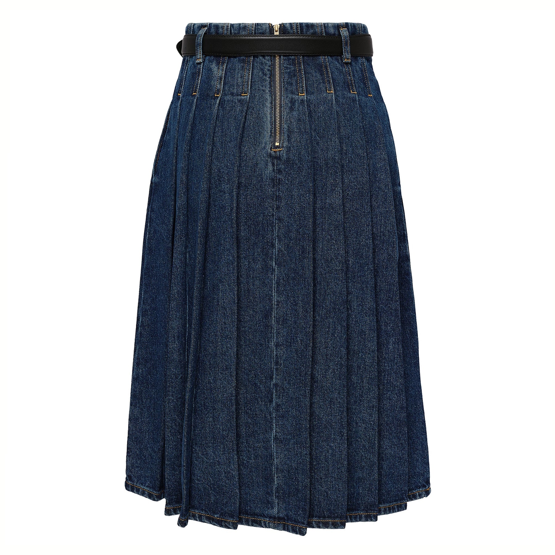 Denim goes demure with this high-waisted midi skirt. Belted to flatter the form, precise pleats and stitch detailing make for an affair to remember. Style with t-shirts and button downs alike.