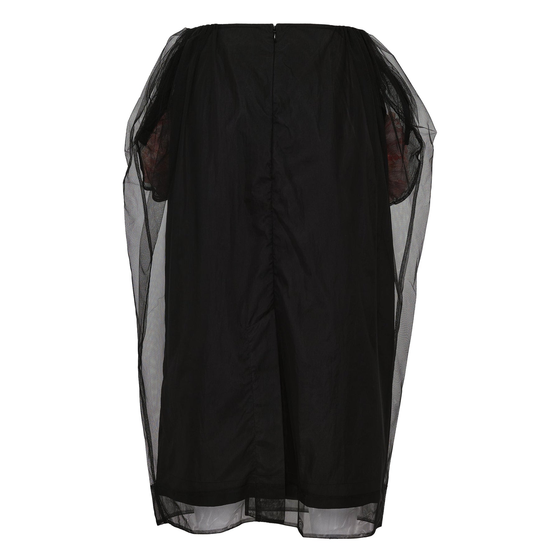 A skirt made of a fine taffeta layered underneath a layer of tulle to create a feeling of preservation. It features pom-pom like flowers layered in front of the pockets for a romantic touch.