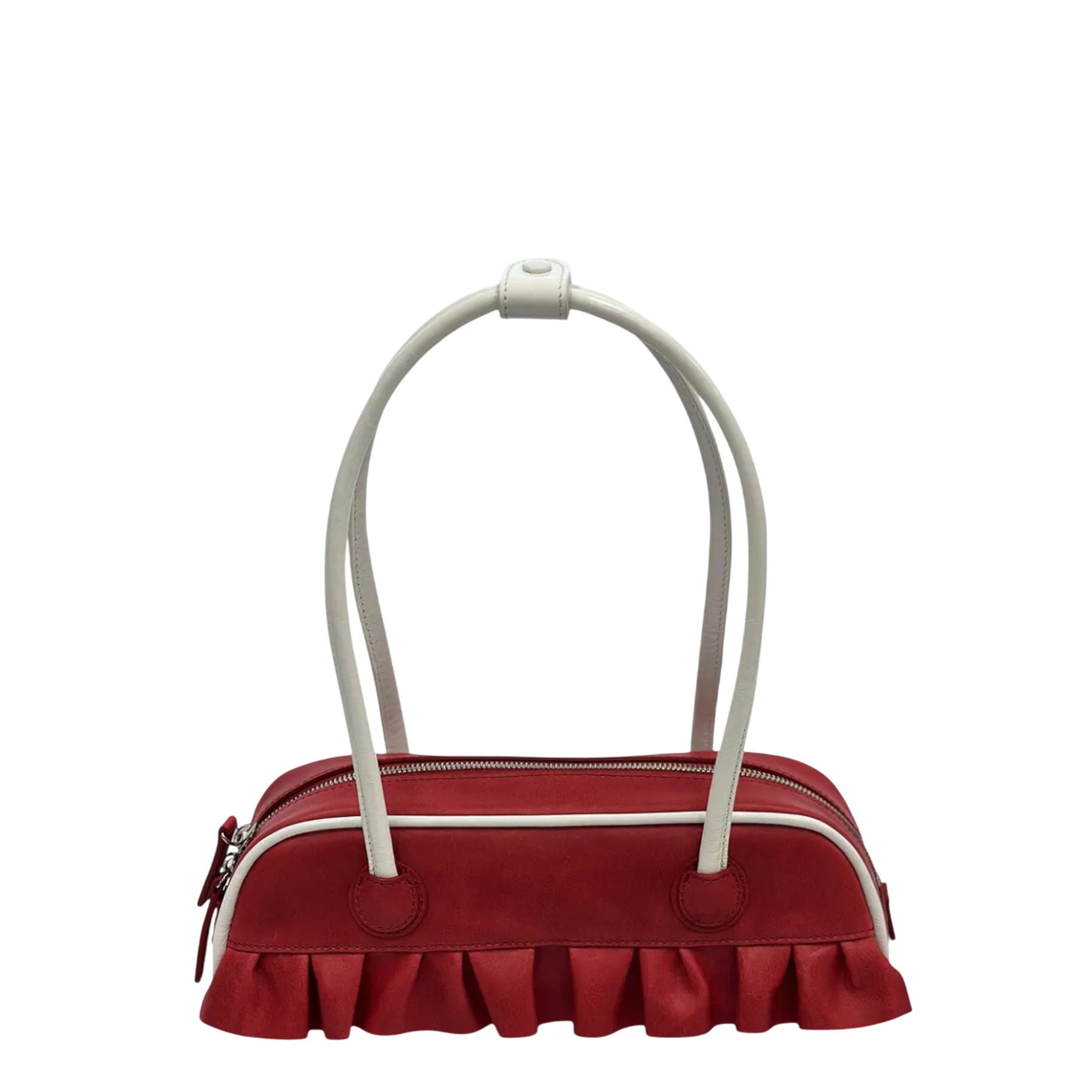 The MARGESHERWOOD Soft Boston Mini Piping Bag delivers contemporary elegance with structured sophistication and practical versatility. Crafted from premium leather in rich burgundy red with contrasting white handles and piping details, featuring a distinctive ruffled base trim. The compact Boston silhouette and dual-zip compartments create an elevated accessory for modern lifestyles.