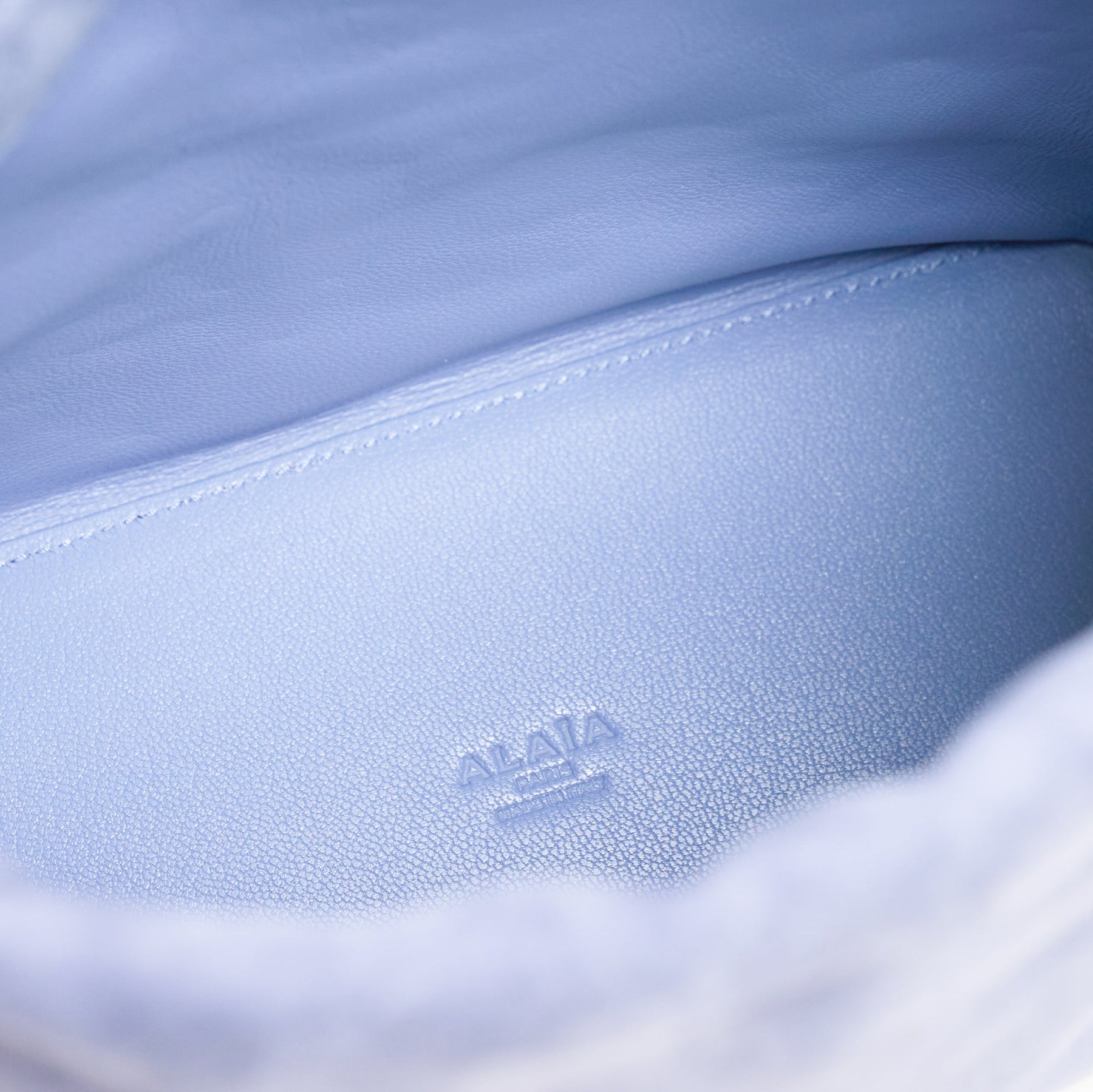 ALAIA Squared Bucket Goatskin delivers architectural sophistication with luxurious Italian leather craftsmanship. Crafted from premium goatskin in soft periwinkle blue, featuring the brand's signature structured silhouette and meticulous construction. The distinctive squared base and drawstring closure create a modern interpretation of the classic bucket bag design.