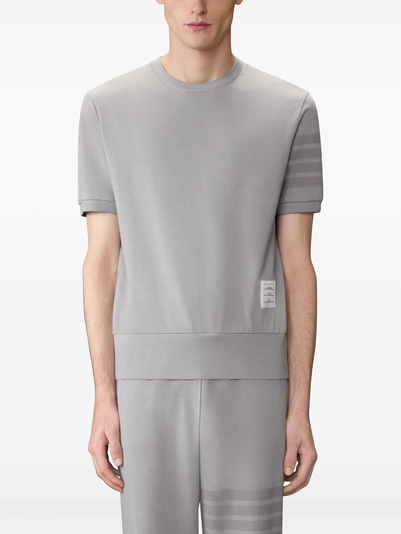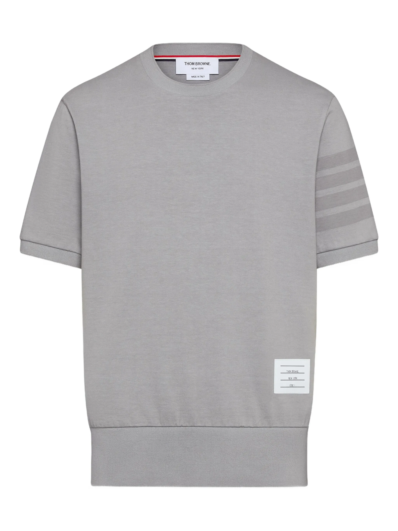 Thom Browne Garment Dyed Short Sleeve Rib Cuff Polo delivers sophisticated preppy style with signature tailored construction. Crafted from premium cotton with garment-dyed finish in sophisticated light gray, featuring classic ribbed collar and cuffs for structured comfort. The signature four-bar stripe detail and extended hem create the brand's iconic modern American sportswear aesthetic.