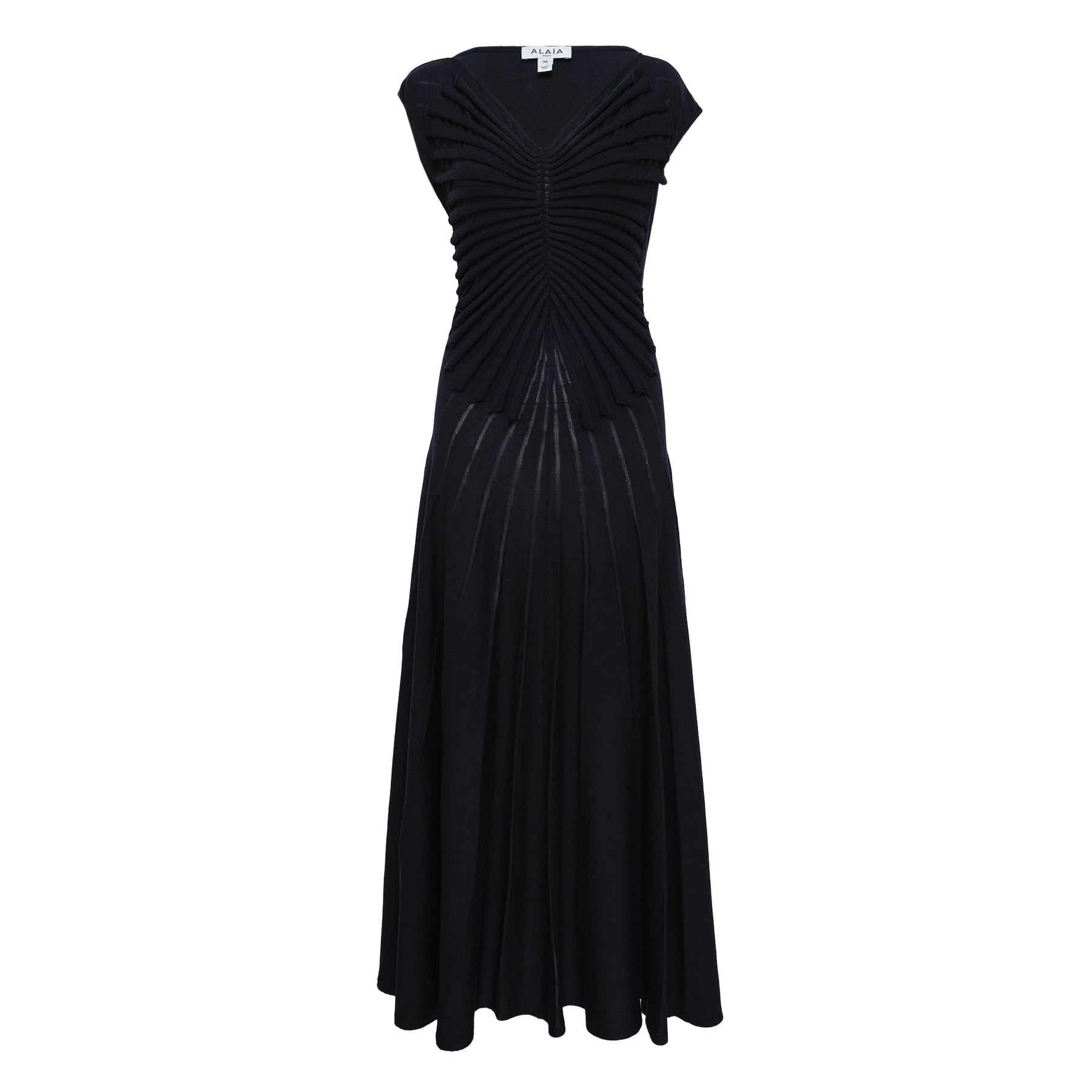 Alaia V Sculpt Dress Wool delivers sculptural elegance with the brand's signature body-conscious silhouette. Crafted from premium wool jersey in deep black, featuring radiating pleats that create a striking sunburst effect across the bodice. The engineered construction and Alaia's mastery of stretch fabrics creates a figure-flattering fit that moves with the body.