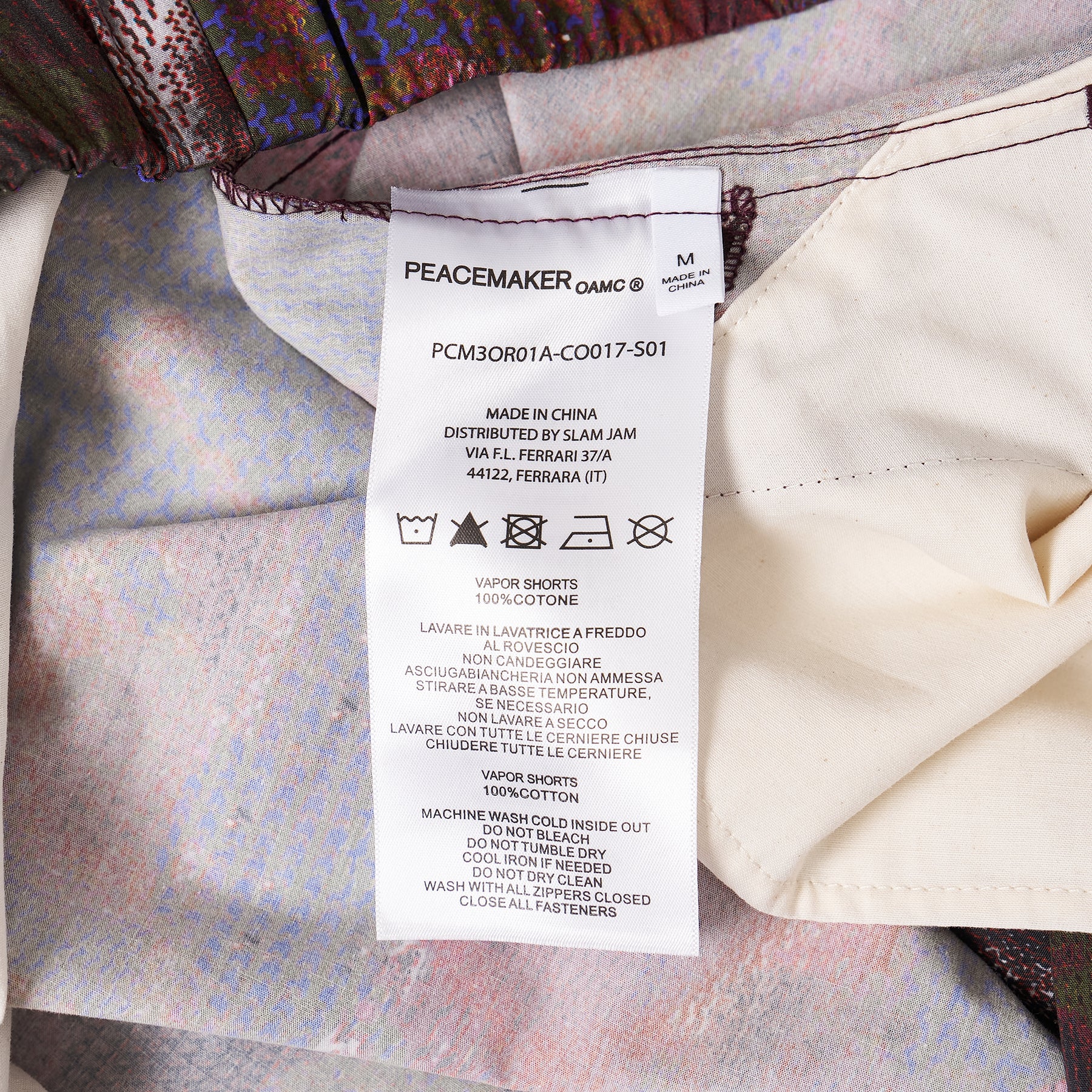 OAMC Peacemaker Vapor Shorts delivers avant-garde streetwear with artistic camouflage construction and contemporary functionality. Crafted from premium technical fabric with metallic mesh overlay in rich burgundy, blue, and pink abstract pattern throughout. The distinctive digital camouflage design and PEACEMAKER branding create a bold statement piece for modern wardrobes.