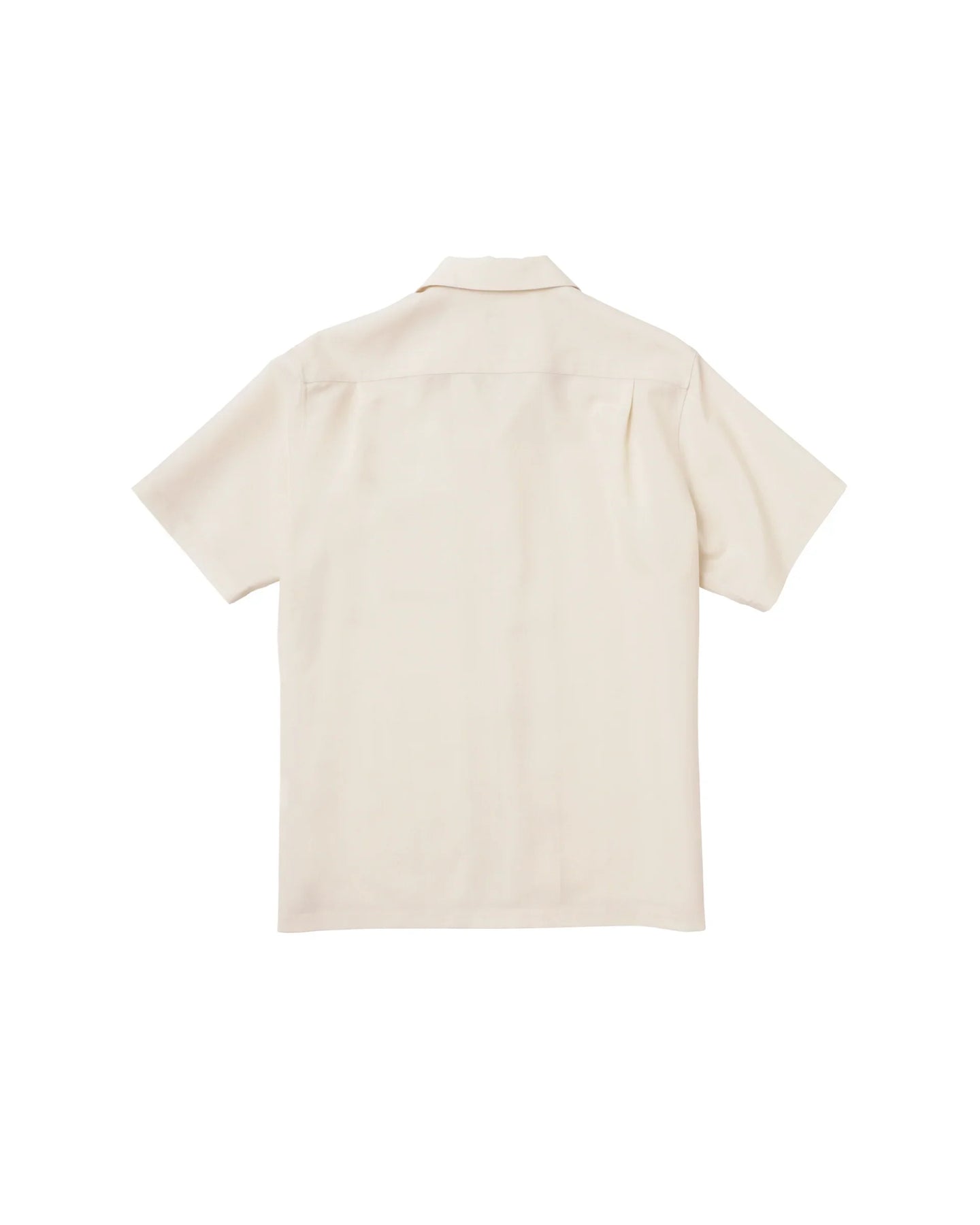 An open-collar wool-mohair shirt, with a sturdy handfeel and high-quality sheen.