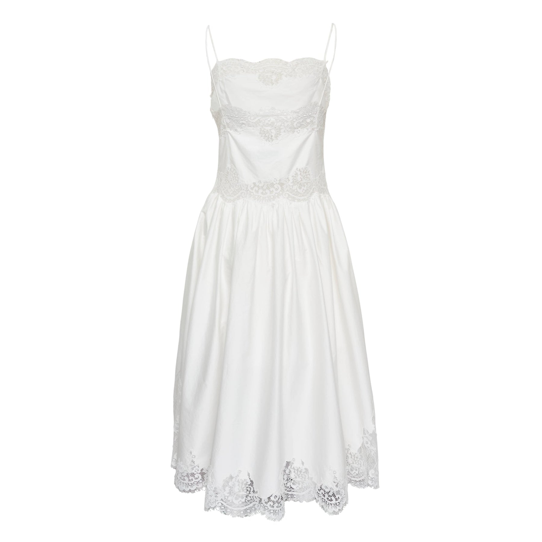 Self-Portrait White Cotton Lace Trim Midi Dress delivers romantic femininity with contemporary tailoring and intricate lace detailing. Crafted from premium cotton with delicate lace trim across the bodice and hem, featuring adjustable spaghetti straps and a flattering midi silhouette. The signature Self-Portrait aesthetic combines vintage-inspired lace work with modern cut for effortless elegance.