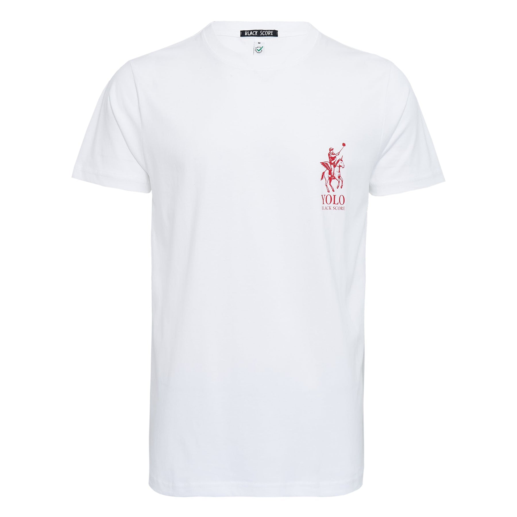 The Black Score YOLO Unisex T-Shirt delivers contemporary streetwear with bold graphic design and versatile styling. Crafted from premium cotton blend in crisp white, featuring the signature polo player logo in striking red detail. The relaxed unisex cut and classic crew neck create an effortlessly cool statement piece for modern wardrobes.