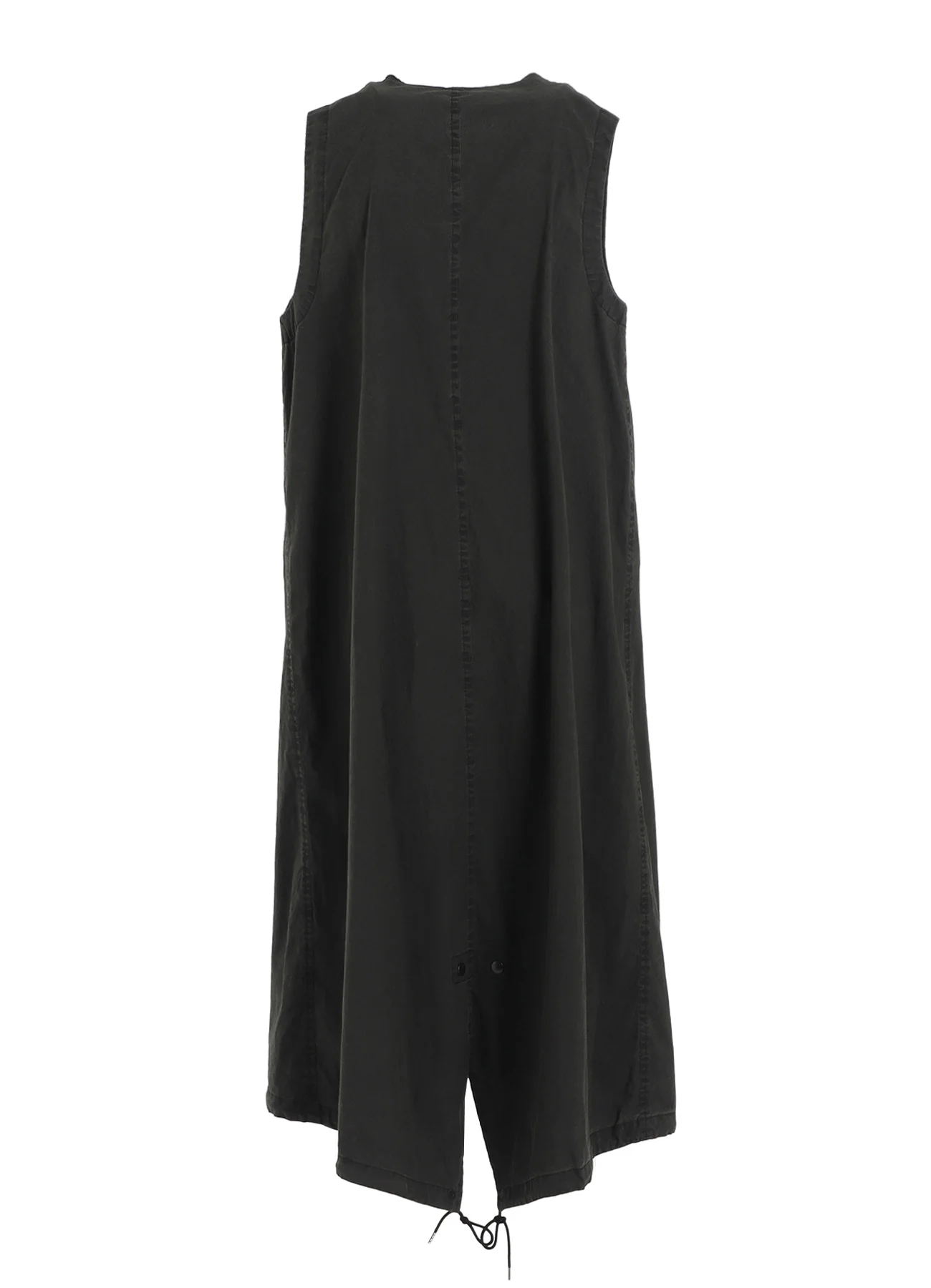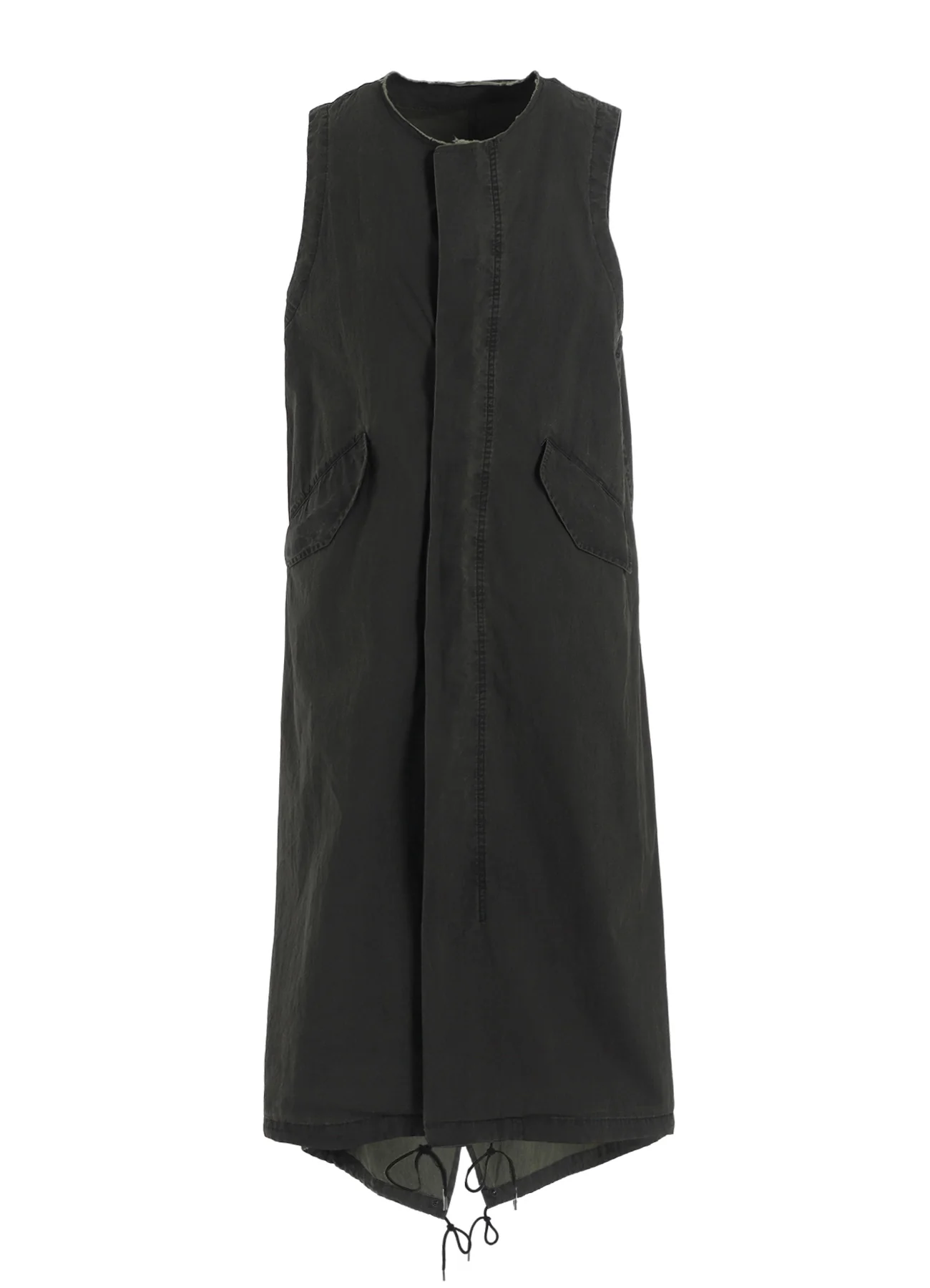 The Fish-Tail Dress made from cotton and nylon features a unique texture and faded look achieved through garment washing. Its design is highlighted by its fish-tail and flaps inspired by a mod coat. This front-opening dress can also be worn as a coat, with each piece showing individual color variations due to the pigment dye.